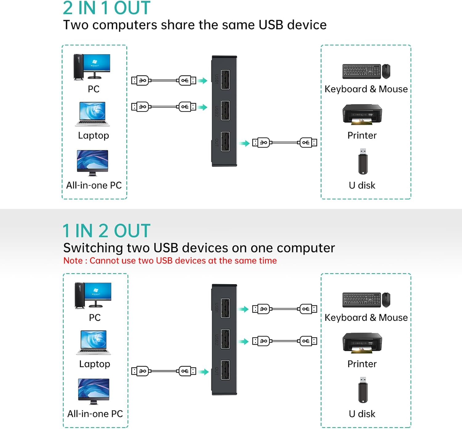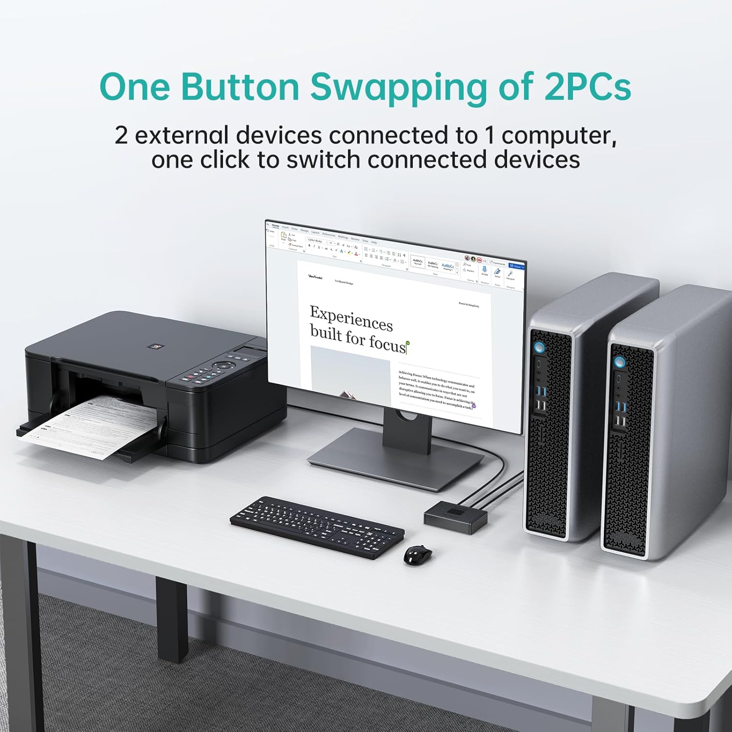 The USB Switch 2 PC supports 1 in 2 out / 2 in 1 out by one Button Switch.LED display shows the working status in real time.Support most USB devices, such as printer, scanner, mouse, keyboard, card reader, flash drive, external hard drives, webcamWidely compatible with Windows 11/10/8/8.1/7/Vista/XP, Mac OS, Linux and Chrome OS.Support USB 3.0,USB 2.0 and USB 1.1 peripheral devicesNo need for an extra driver & No power required & Plug and play.5 Gbps data transmit speed