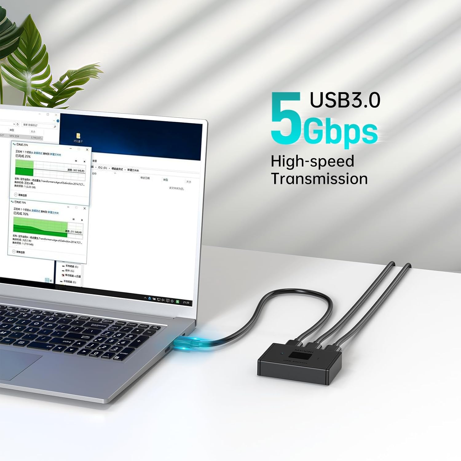 USB3.0 : It is a USB 3.0Switch reaching up to 5Gbps spped. You can connect 2 computers with 1 keyboard or share 1 printer and switch the computer just need one click, making your work more efficient and your desktop tidier.