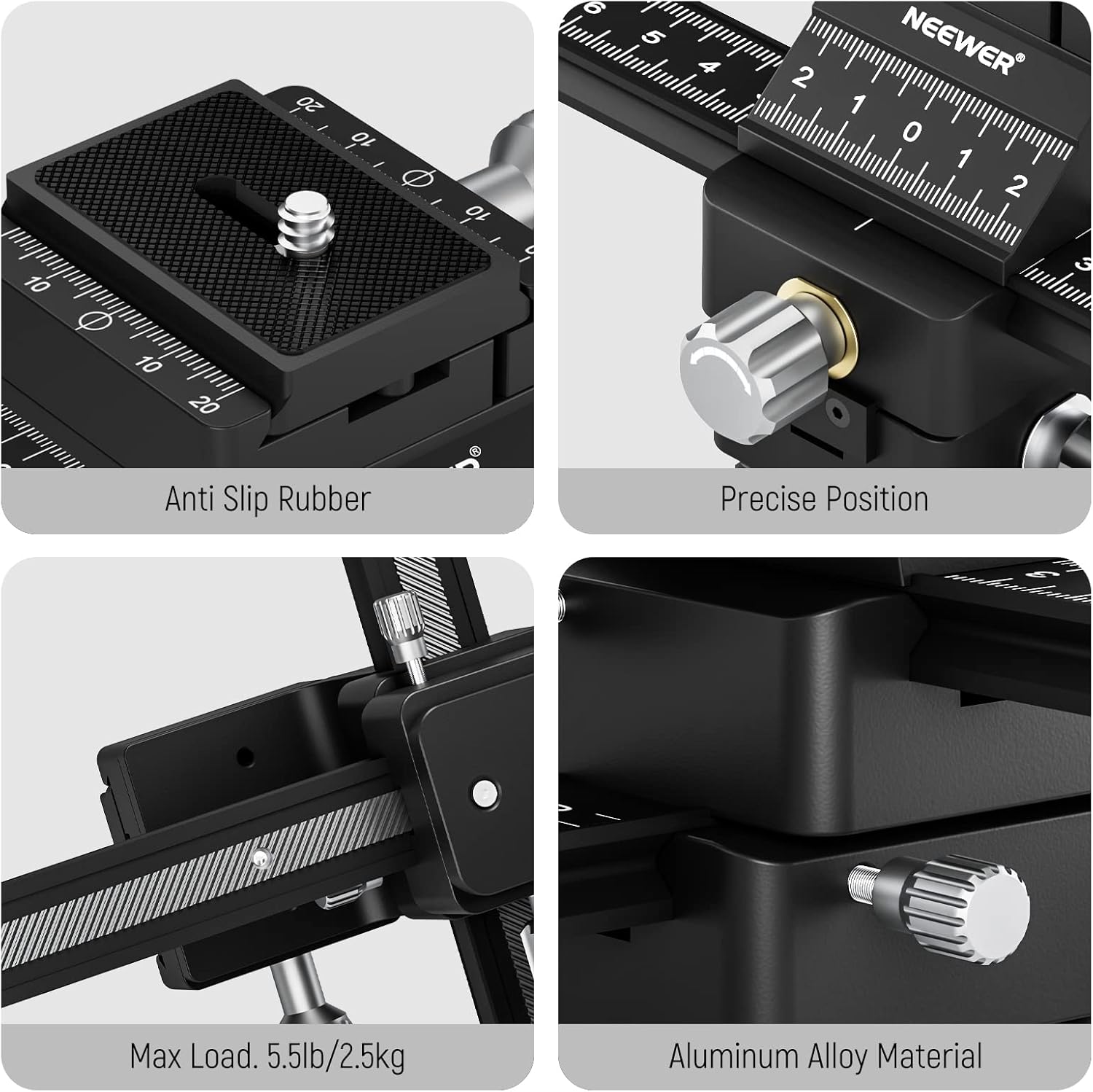 4-way precise movement: 4 directional movements: left, right, forward and backward. Large screw knobs allow you to make precise adjustments with the help of convenient numerical scales. Note: for stable shooting, please attach the horizontal adjustment knob when adjusting the vertical axis and vice versa
