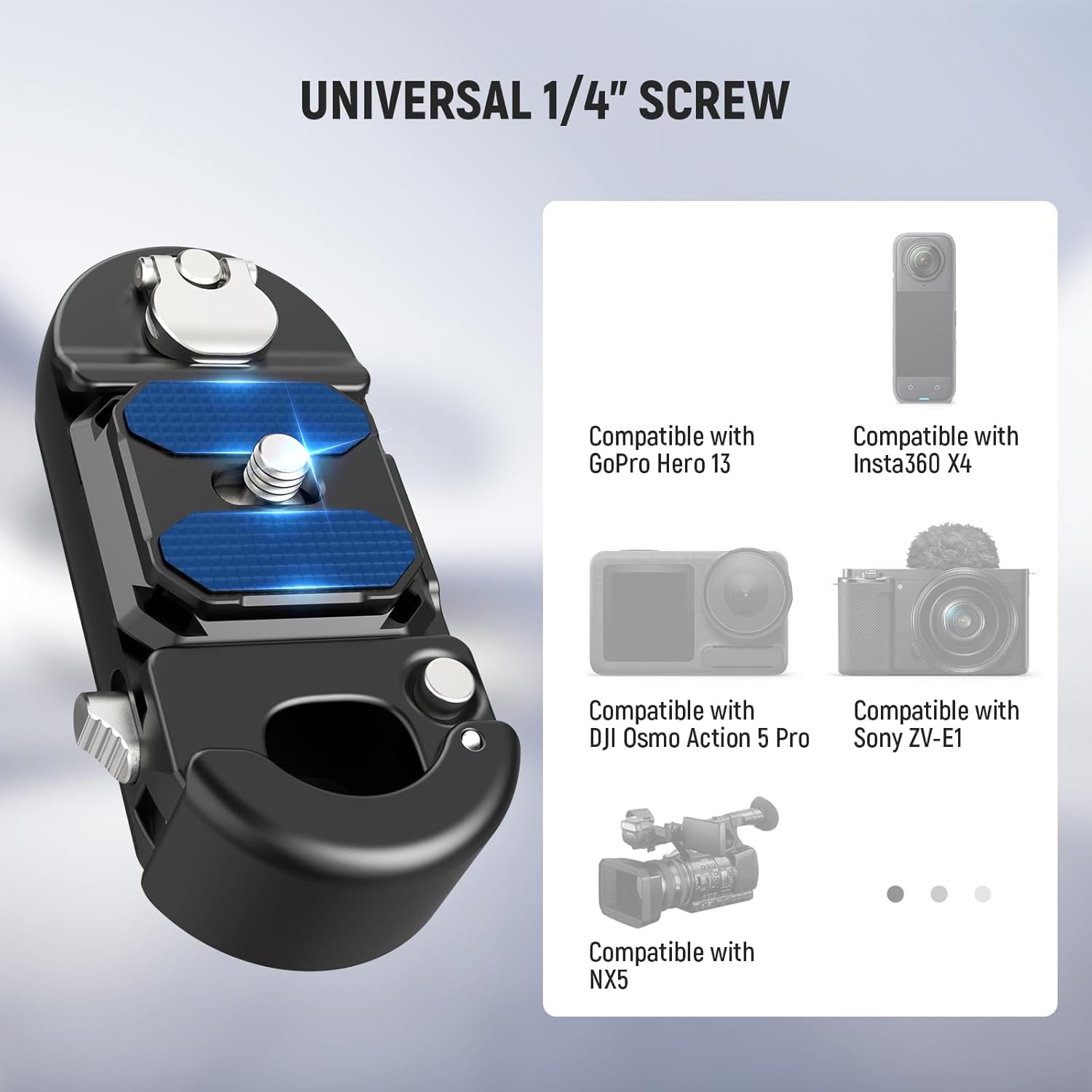 【Universal 1/4″ Screw】 The top 1/4″ mounting screw on this quick release clamp photography accessory is compatible with Canon Nikon Sony DSLR cameras, mirrorless cameras, camcorders, compatible with GoPro Max 360 Hero 13 Go Pro 12 Creator Edition 11 10 9 8 7 Black, compatible with Insta360 x4 compatible with DJI action cameras (adapters or attachments not included), and more gear. Nonslip rubber pads within the backpack clip mount protect your pricey device against scratches
