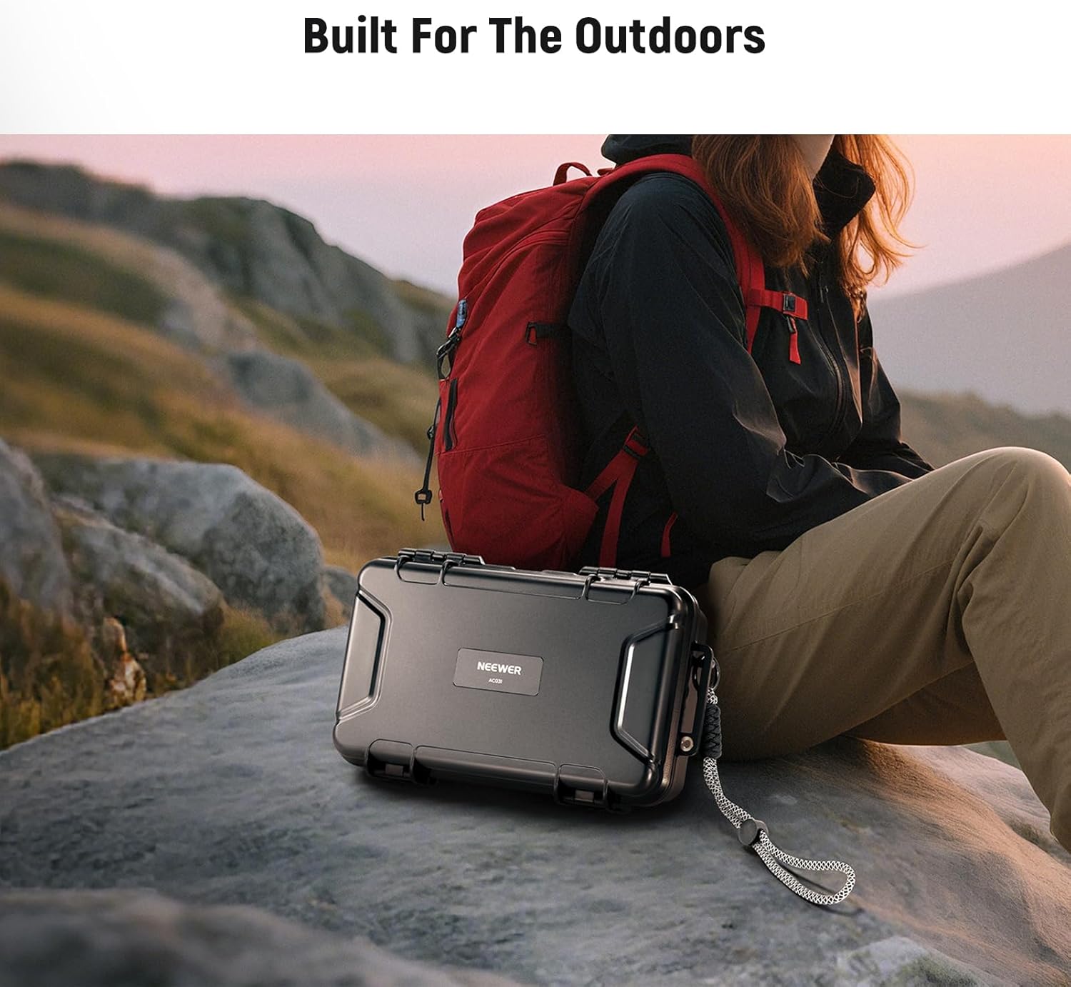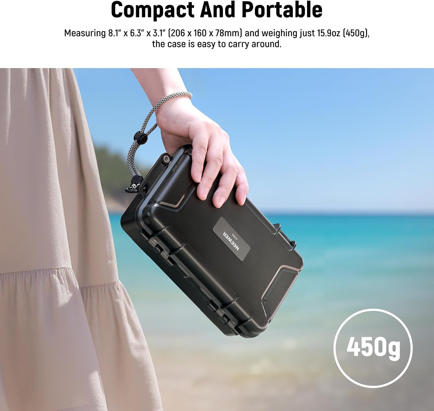 【Compact & Portable】 Measuring 8.1″ x 6.3″ x 3.1″ (206 x 160 x 78mm) and weighing just 15.9oz (450g), this lightweight case easily fits into a camera bag or suitcase. A wrist strap and carabiner allow for effortless carrying or attachment to a backpack—ideal for outdoor adventures, action packed moment photography, travel vlogs, and location filming as content creator essential accessories and influencer must have gear