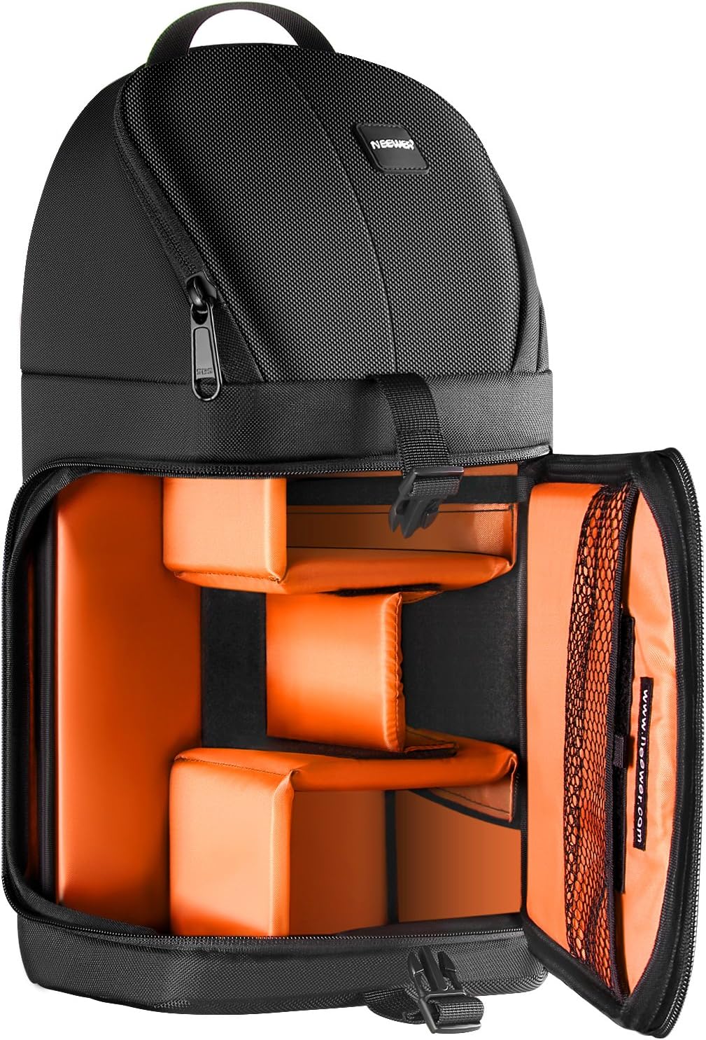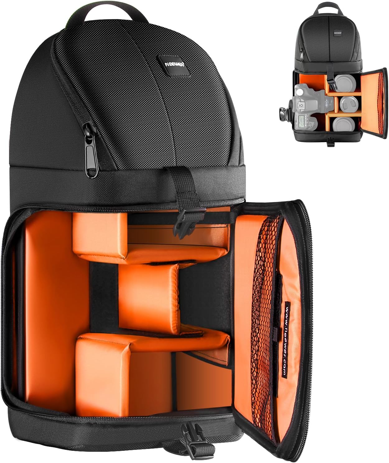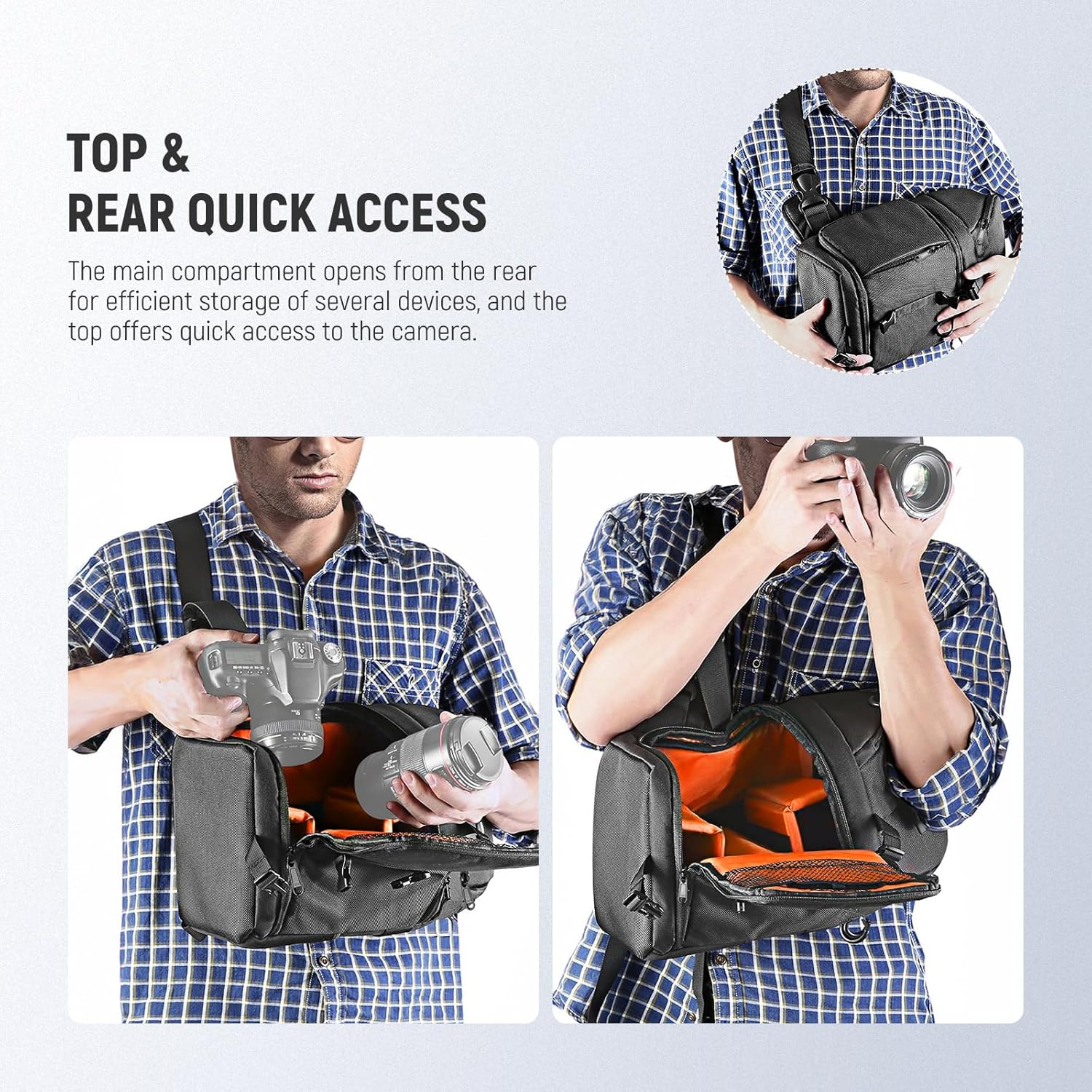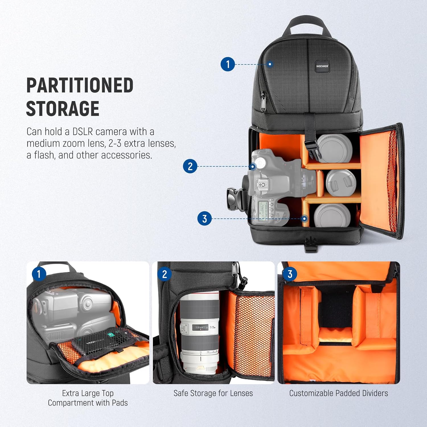 Multiple use and durable material: fastening strap padded adjustable dividers, mesh pockets for smaller accessories, tripod/monopod holder with fixed strap and quick access side doors. With water-repellent polyester rain cover