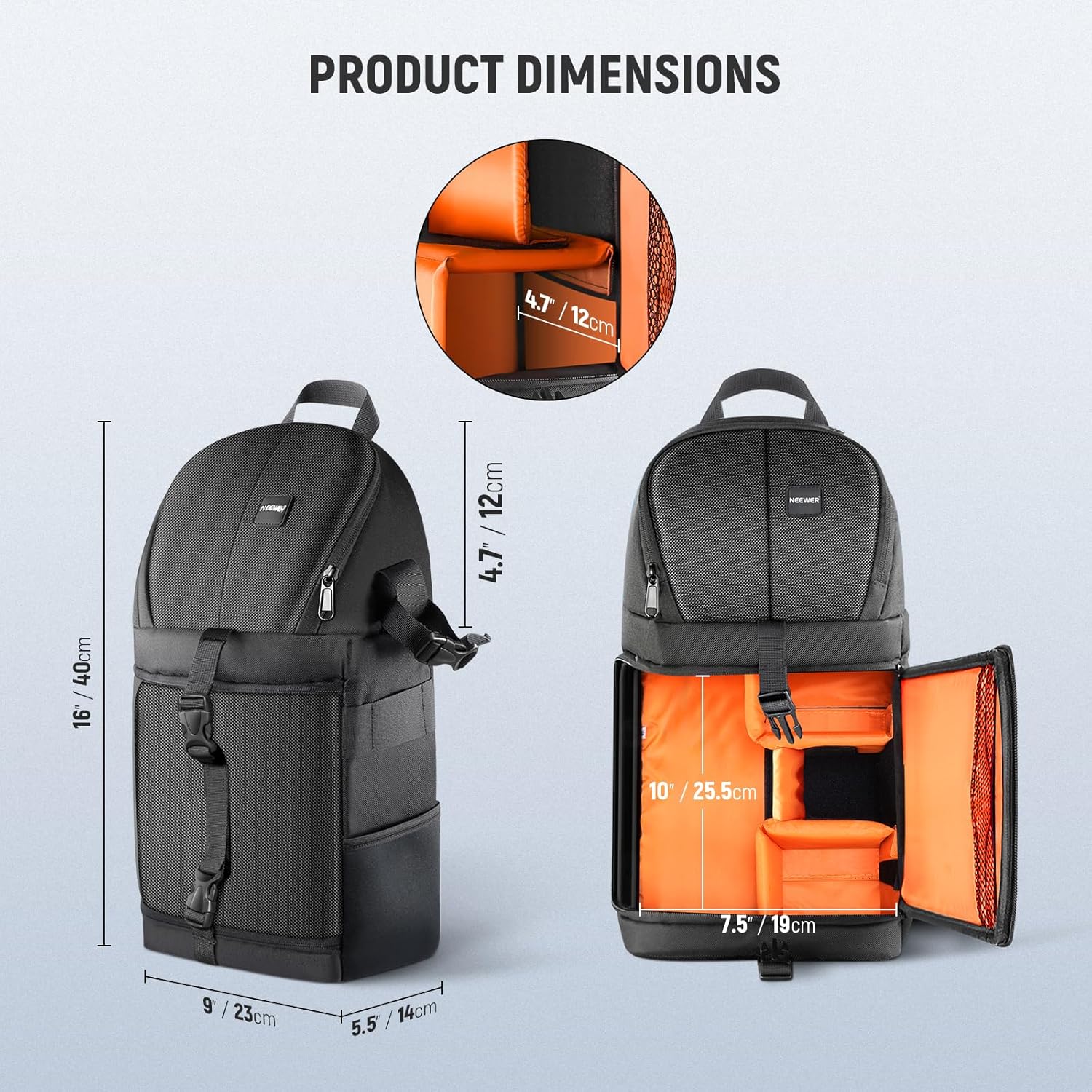 CAPACITY: Fits a DSLR body, 2-3 additional lenses, a flash light or other accessories. A water bottle or monopod tripod, as well as other small items are able to place in it. External dimensions: 9 x 5.5 x 16 inches / 23 cm x 14 cm x 40 cm (L x W x H)