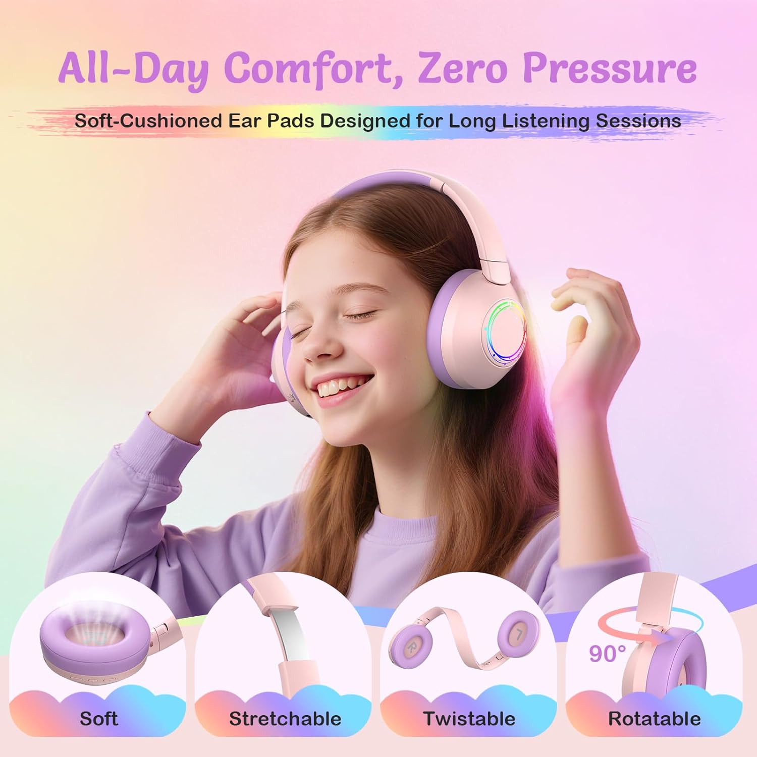 Colorful Flowing RGB Lights:Light up every moment with dynamic, flowing RGB effects that pulse with your music. Whether your child is watching videos, gaming, or relaxing, the soft glow adds an immersive, playful atmosphere. These kids Bluetooth headphones blend style and function—perfect for kids and teens who want standout children’s headphones with fun personality.
