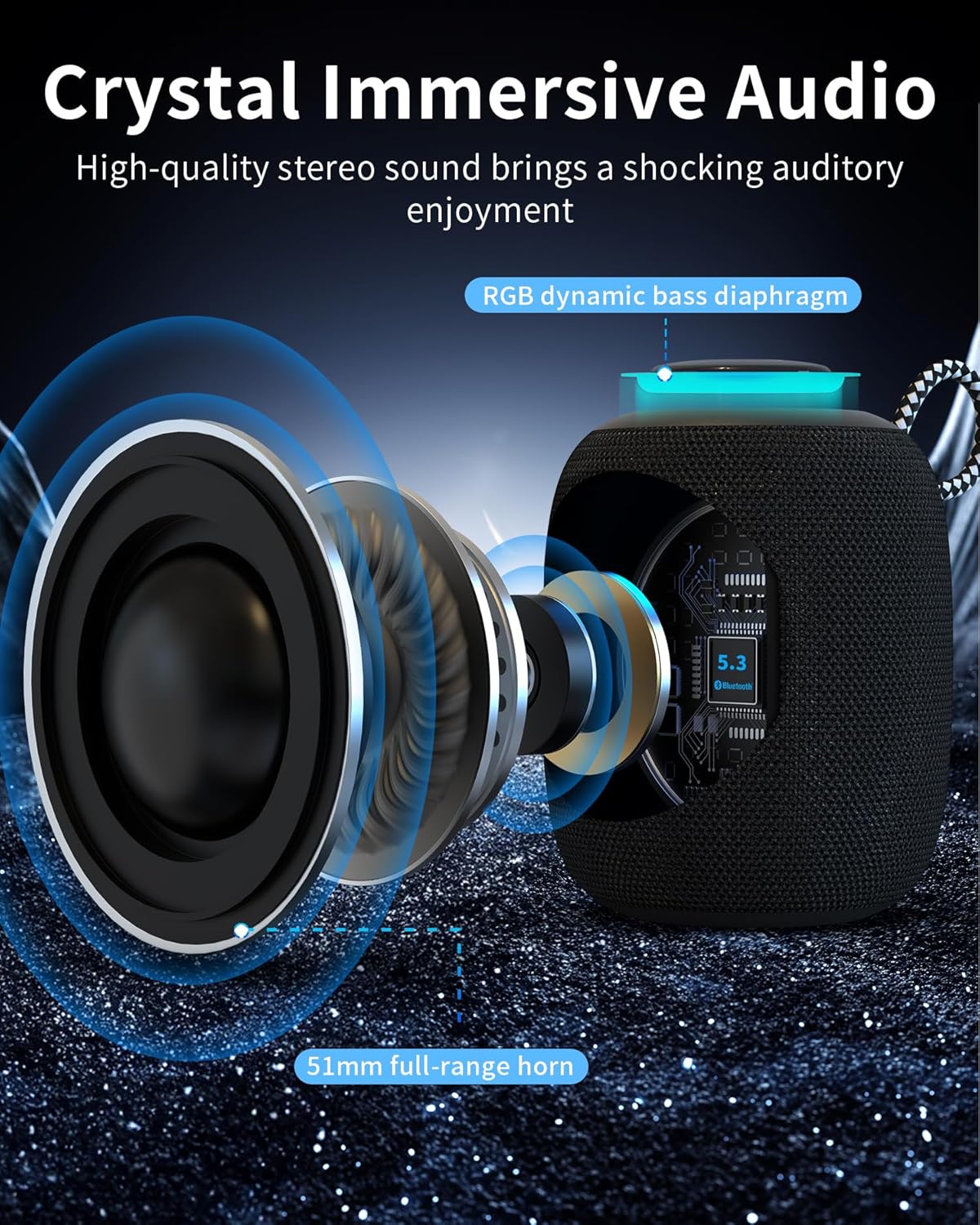 【Dynamic Lighting Effects】Transform surroundings with Oraolo Bluetooth Speaker’s vibrant lighting effects. Featuring multiple dazzling light modes, It allows people to customize ambiance effortlessly. Whether you’re hosting a lively party or enjoying a quiet evening, the dynamic lights can be tailored to enhance the mood. The light effects synchronize with your music play, creating an engaging and visually stunning experience.
