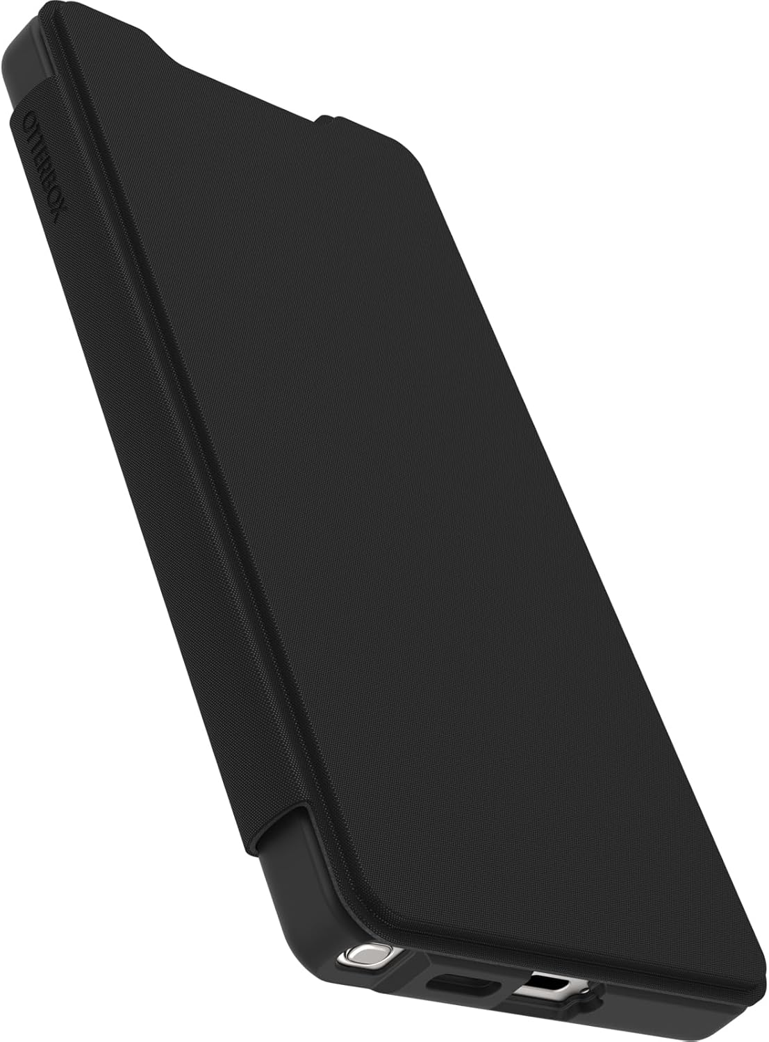 The folio cover protects the screen and includes a vertical slot to secure cash and cards.