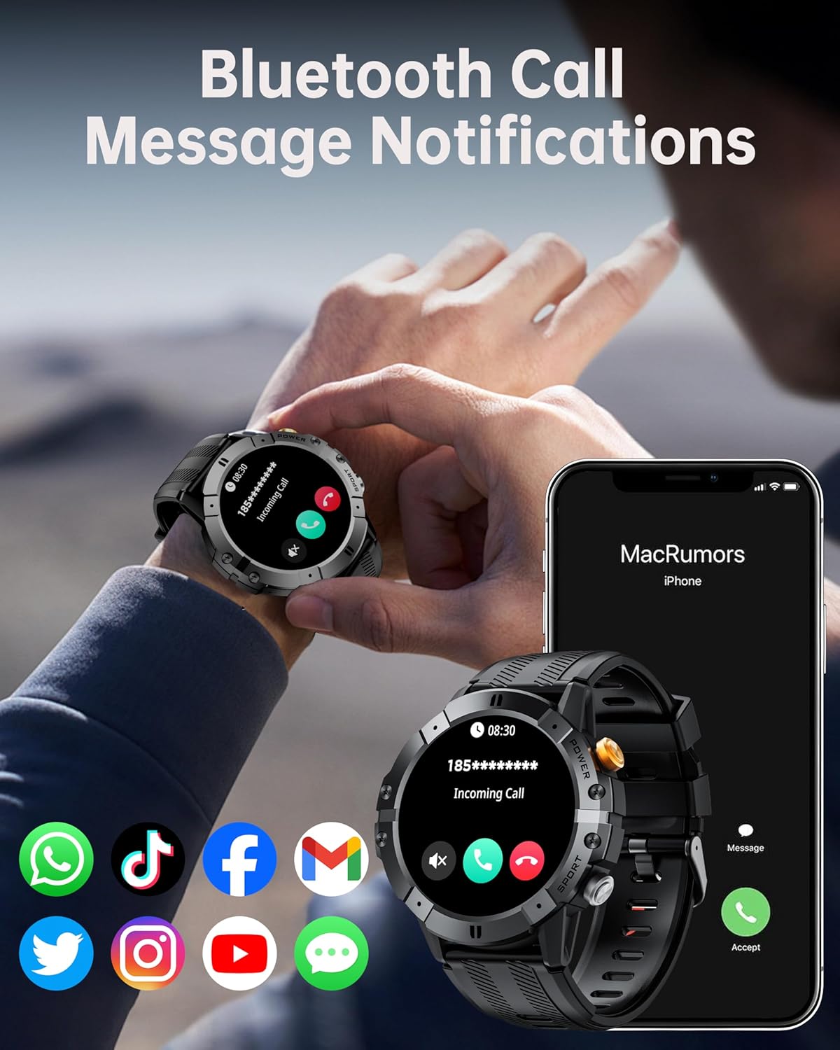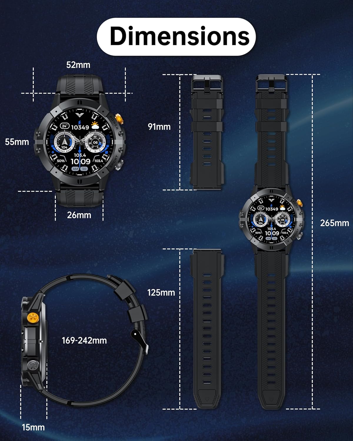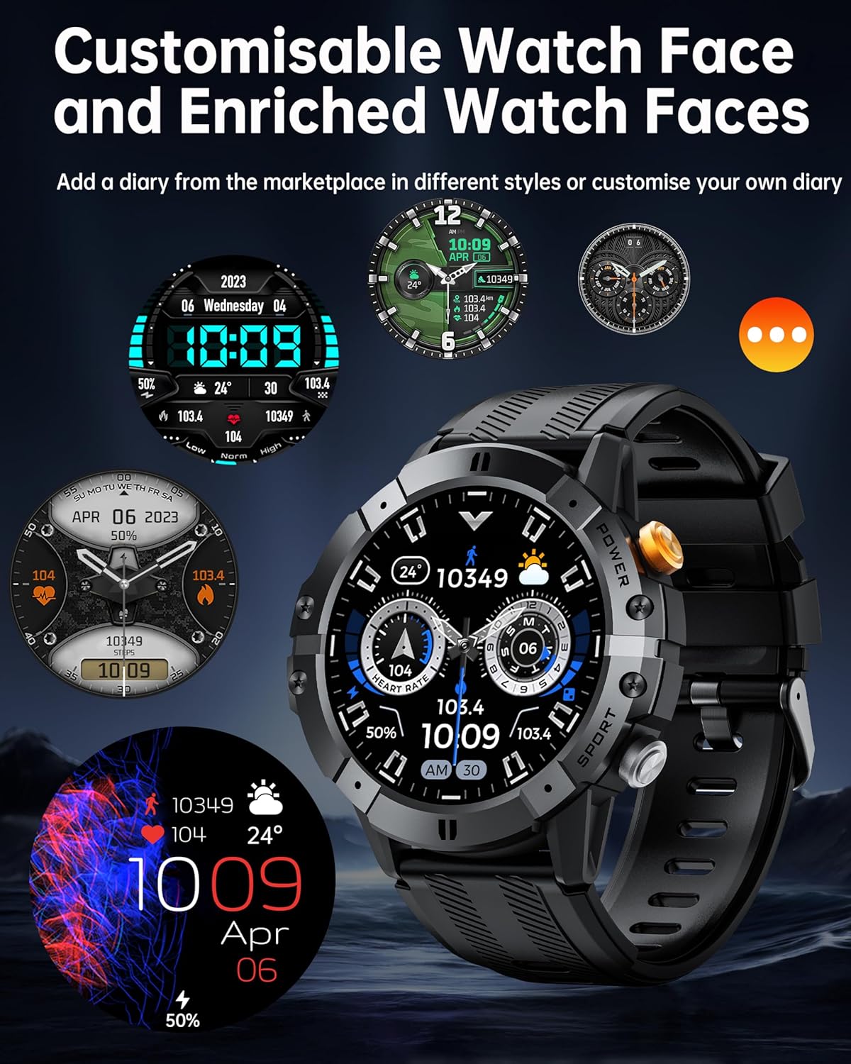 Men’s Rugged Smartwatch: military smart watches for men,which features a 1.52-inch TFT display with three stylish customizable watch faces: default face + photo/custom face. Choose your favorite photo as the watch screen. Includes an adjustable silicone/nylon strap with a skin-friendly design suitable for sensitive skin. The perfect smartwatch for men.