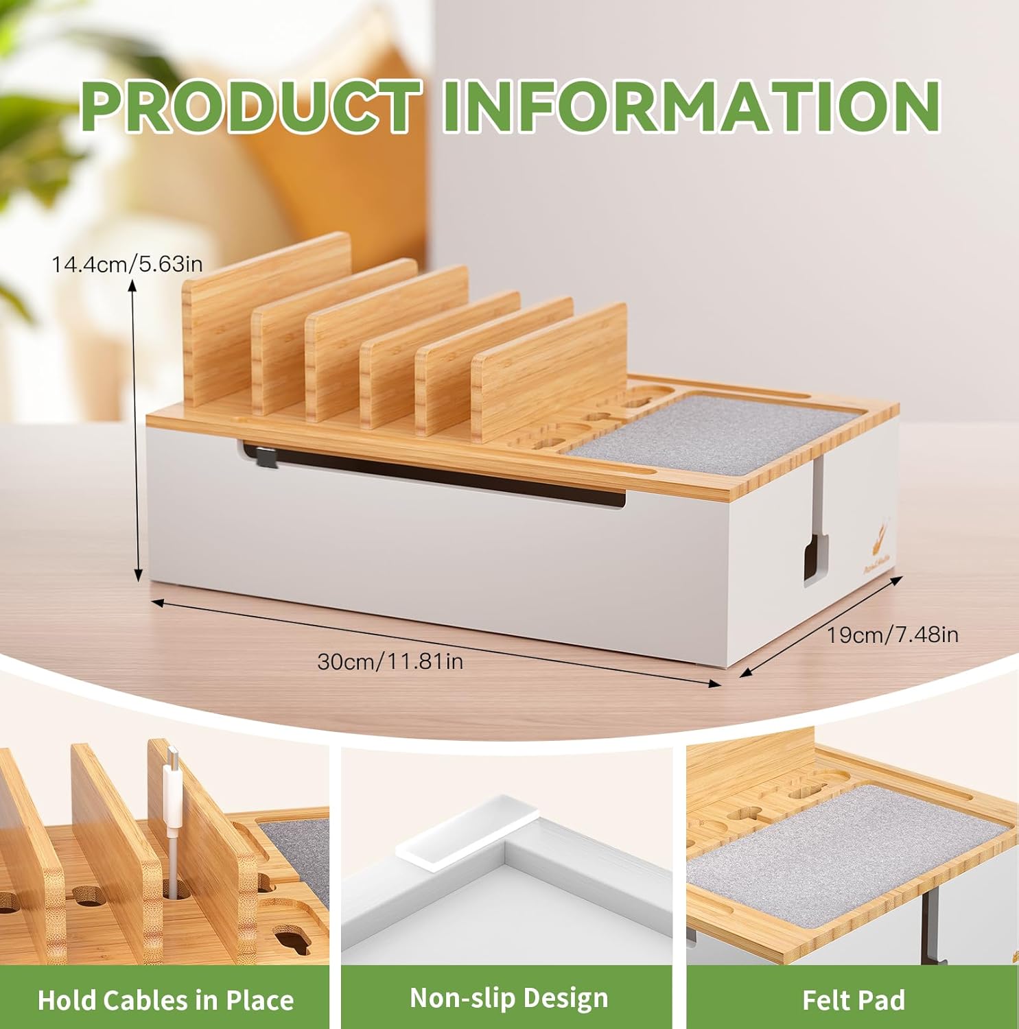 Larger and Wider Base: The dock Station have a larger and wider base (Size 30 x 19 cm) sultable for a variety of power supplies. It can easily store the power strip and hide the cables for greater safety. Four anti-slip pads on the bottom increase the stability
