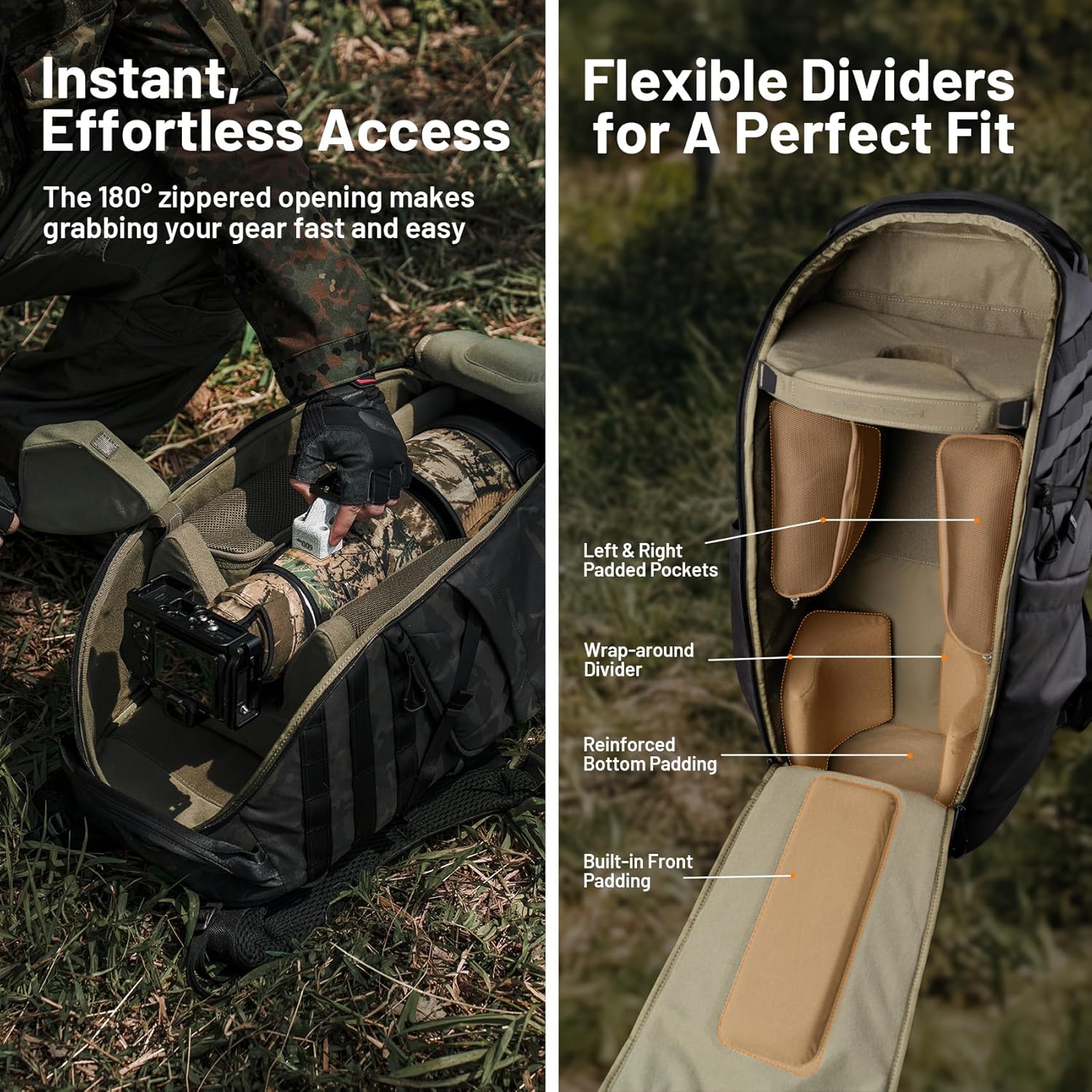 Large-Opening Access & Flexible Storage: Featuring a large front opening, Quick and easy retrieval of equipment. Customizable DIY dividers securely hold a 600mm prime lens with a camera body or adjust to fit smaller lenses like a 400mm prime alongside additional gear.(Supports a fixed focal length lens up to 1200mm plus camera body)