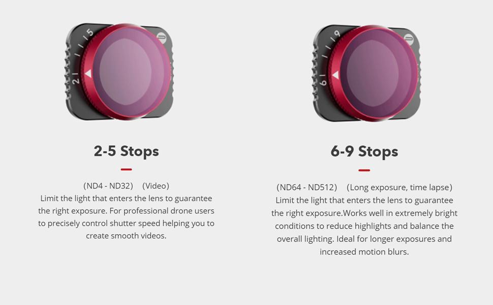 Variable Neutral Density Filter providing between 6-9 (equivelant to ND64-ND512) stops to give greater control on light and enable increased exposure control to create a dynamic blur effect to your images