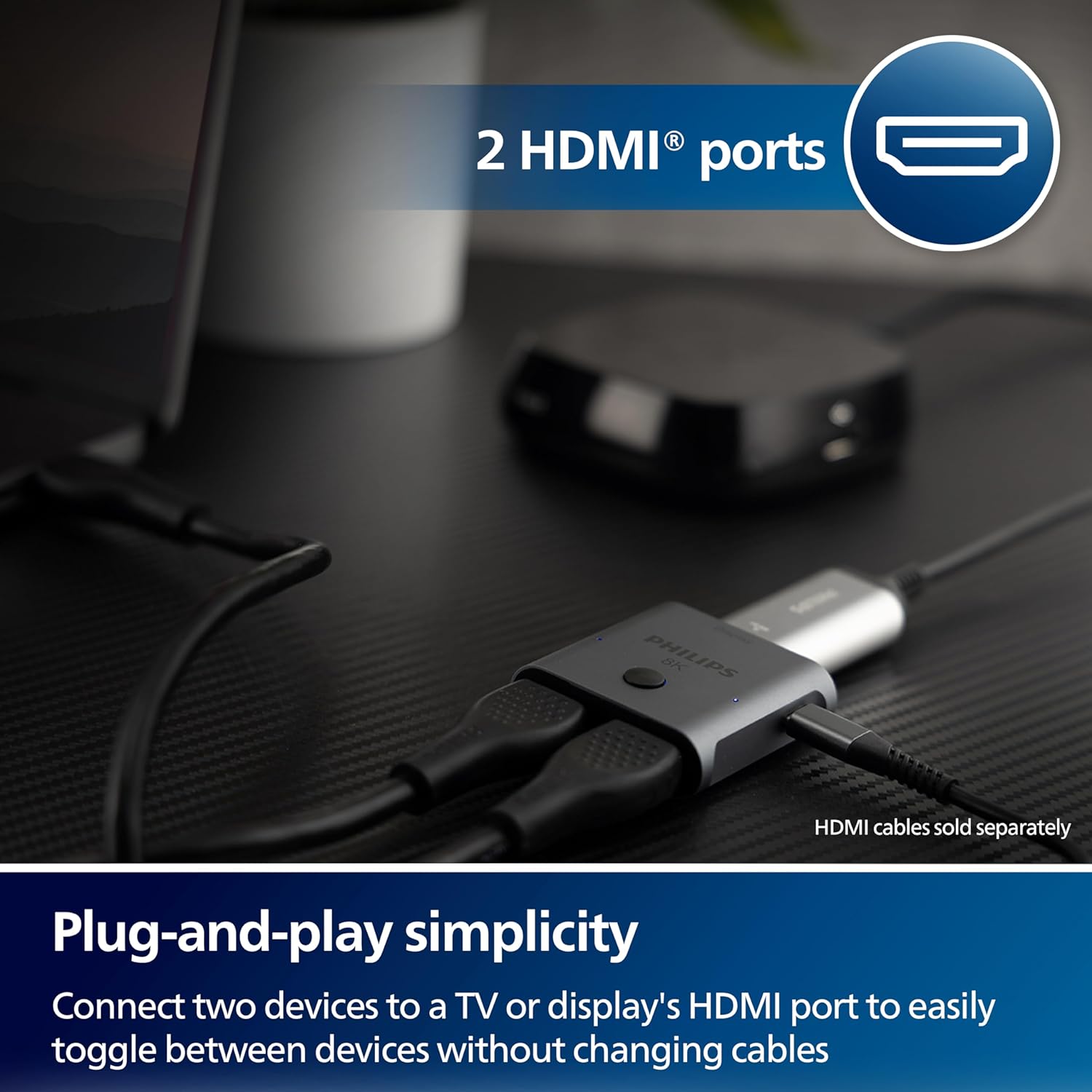 Simplify your entertainment setup with the Philips Elite 8K 2-Port HDMI 2.1 Switch. When you’ve maxed out your TV’s ability to connect to your favorite high-definition devices, this 8K and 4K HDMI switch turns one TV HDMI port into two. Easily change from one source to the other by pressing the button on the HDMI switcher. LED indicator lights clearly indicate which connected device is selected for use. Enjoy the ease of toggling between devices without the hassle of changing cables. This compact HDMI switch in a premium aluminum housing works with all brands of HDMI cables and devices like TVs, Blu-ray/DVD and streaming media players, gaming consoles and more. Additional HDMI cables, sold separately, are required to connect each source device to the HDMI switcher. A 6-foot USB cable is included to connect the switch to a USB-equipped wall outlet or your TV’s USB port for power, if needed. Designed for immersive HDTV, this AV switch is HDCP 2.2 compatible and supports high-resolution video up to 8K at 60 Hz and 4K at 120 Hz, Dolby Atmos, HD Dolby 7.1 surround sound and more. Take charge of your entertainment with the Philips Elite 8K 2-Port HDMI 2.1 Switch.