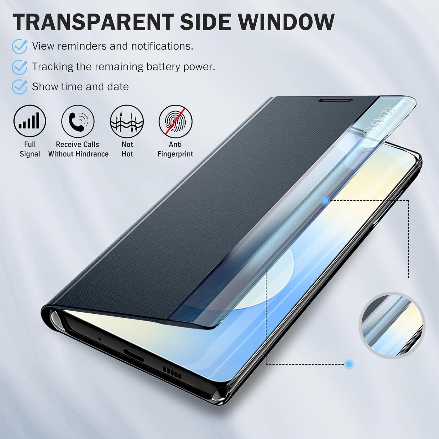 Transparent side window to display reminders and notifications, track remaining battery power, display time and date