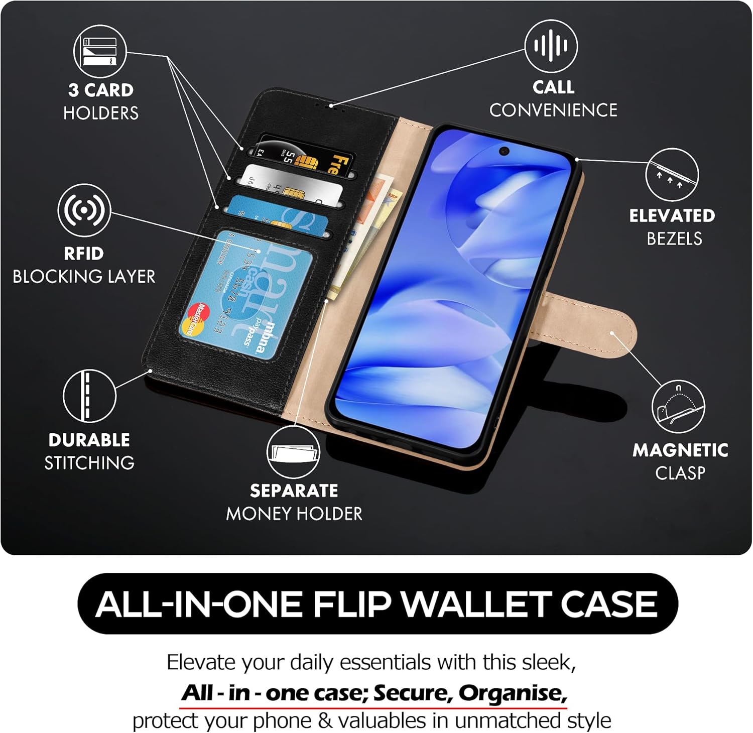 [MULTI-FUNCTION] This case is designed with card Slot, engineered with strong magnetic closure for safety and security of your belongings along with all-around protection.