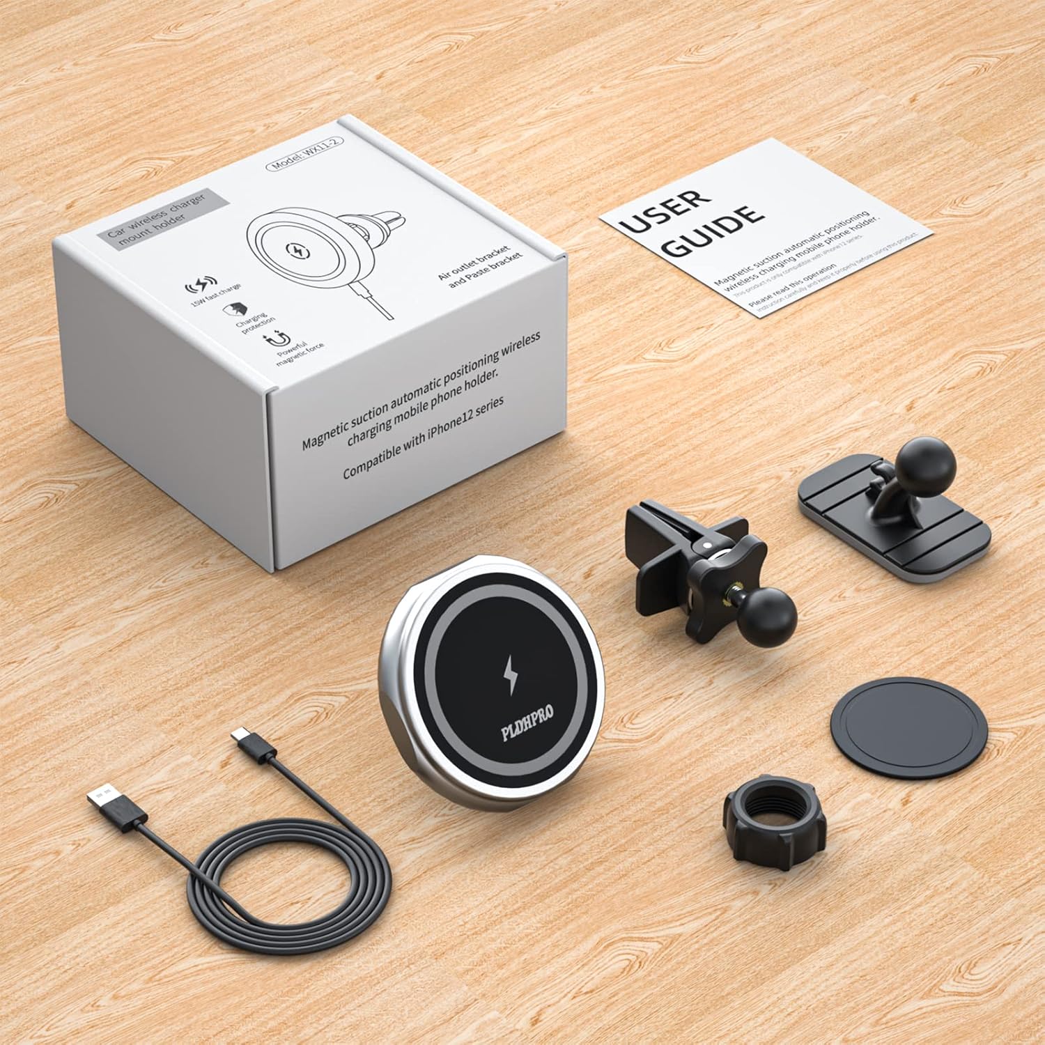1x Mag-safe Car Charger, 1x Air Vent Clip, 1x Suction Cup Patch, 1x Charging Cable,1xMetal plate