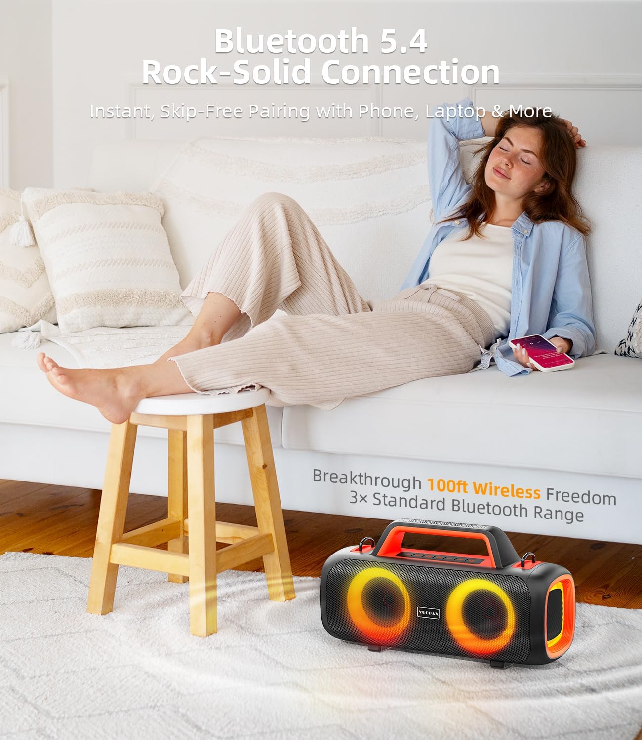 ๐๐๐๐ ๐๐๐๐ค ๐๐จ๐ฐ๐๐ซ & ๐๐ฆ๐ฆ๐๐ซ๐ฌ๐ข๐ฏ๐ ๐๐ญ๐๐ซ๐๐จ ๐๐จ๐ฎ๐ง๐:Powered by 2 subwoofers, 2 tweeters, and a dedicated Bass Boost function, this Bluetooth speaker delivers a thunderous 140W peak output. Whether youโre hosting a backyard BBQ, a beach party, or a festival-style gathering, the rich, distortion-free bass and crisp highs fill the air, creating a truly immersive audio experience that makes every beat feel alive and gets the whole crowd moving.
