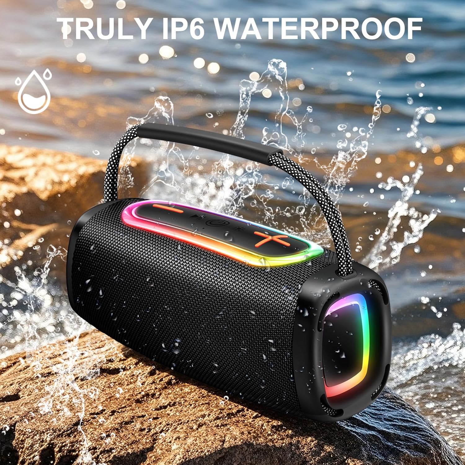 IP6 Waterproof Speaker: This bluetooth outdoor speaker features a durable design and an IP6 rating for protection against water splashes and spills. Perfect for using in house parties or taking to pool parties, beach parties, barbecues, biking, hiking, camping, etc. No need to worry about the weather and the environment. The Bluetooth speaker comes with a soft carrying rope for easy carrying.