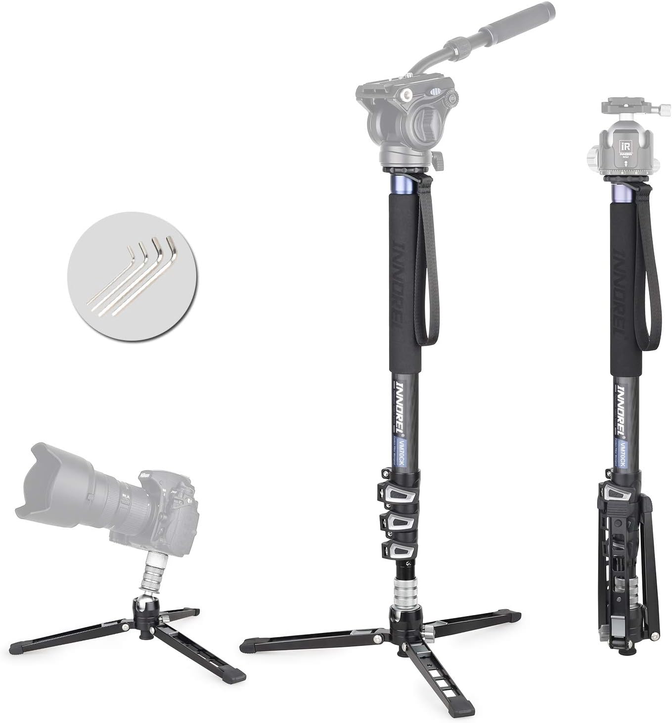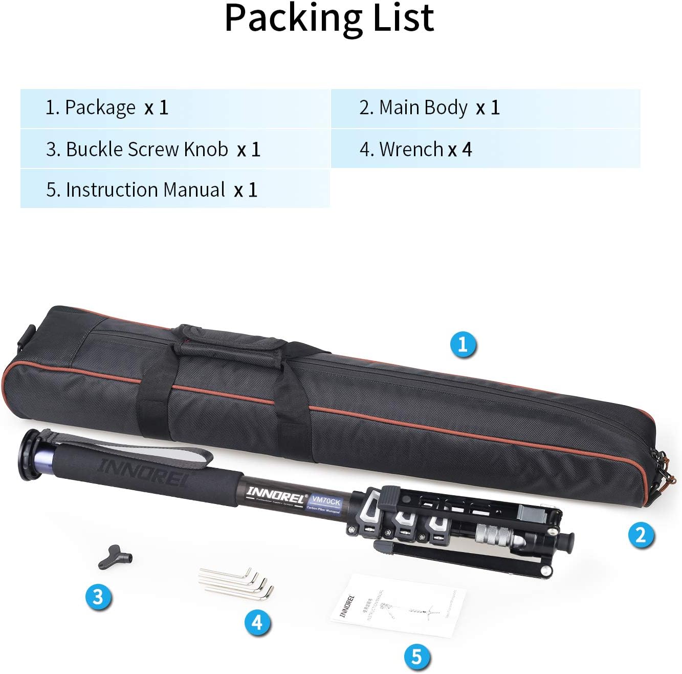 【PACKING LIST】There is a monopod bag,a VM70CK, a buckle screw knob,4 wrenches and a instruction manual in the package.