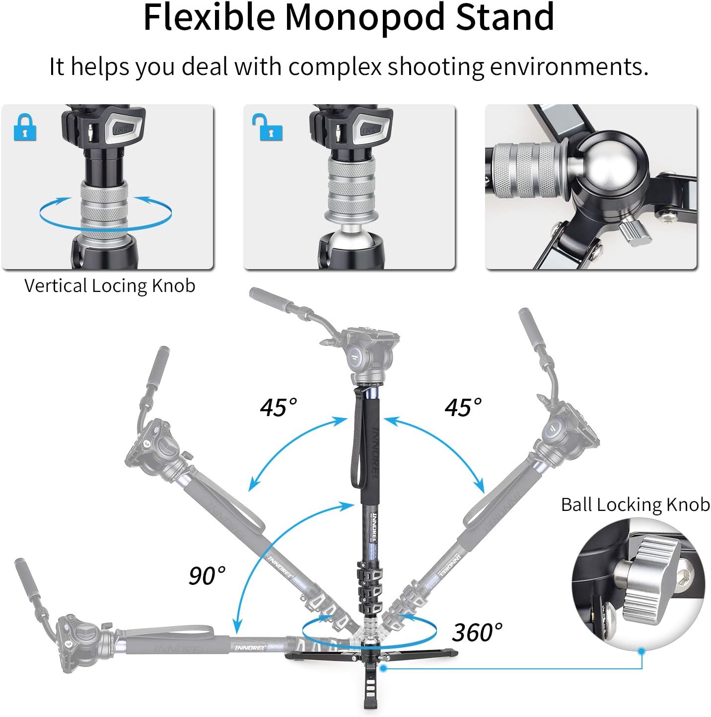 【MULTIFUNCTIONAL TRIPOD BASE】–The base of VM70CK monopod kit can be easily switched from vertical mode to horizontal, it helps you deal with complex shooting environment. The removable base can be used as a Mini table-top tripod too.