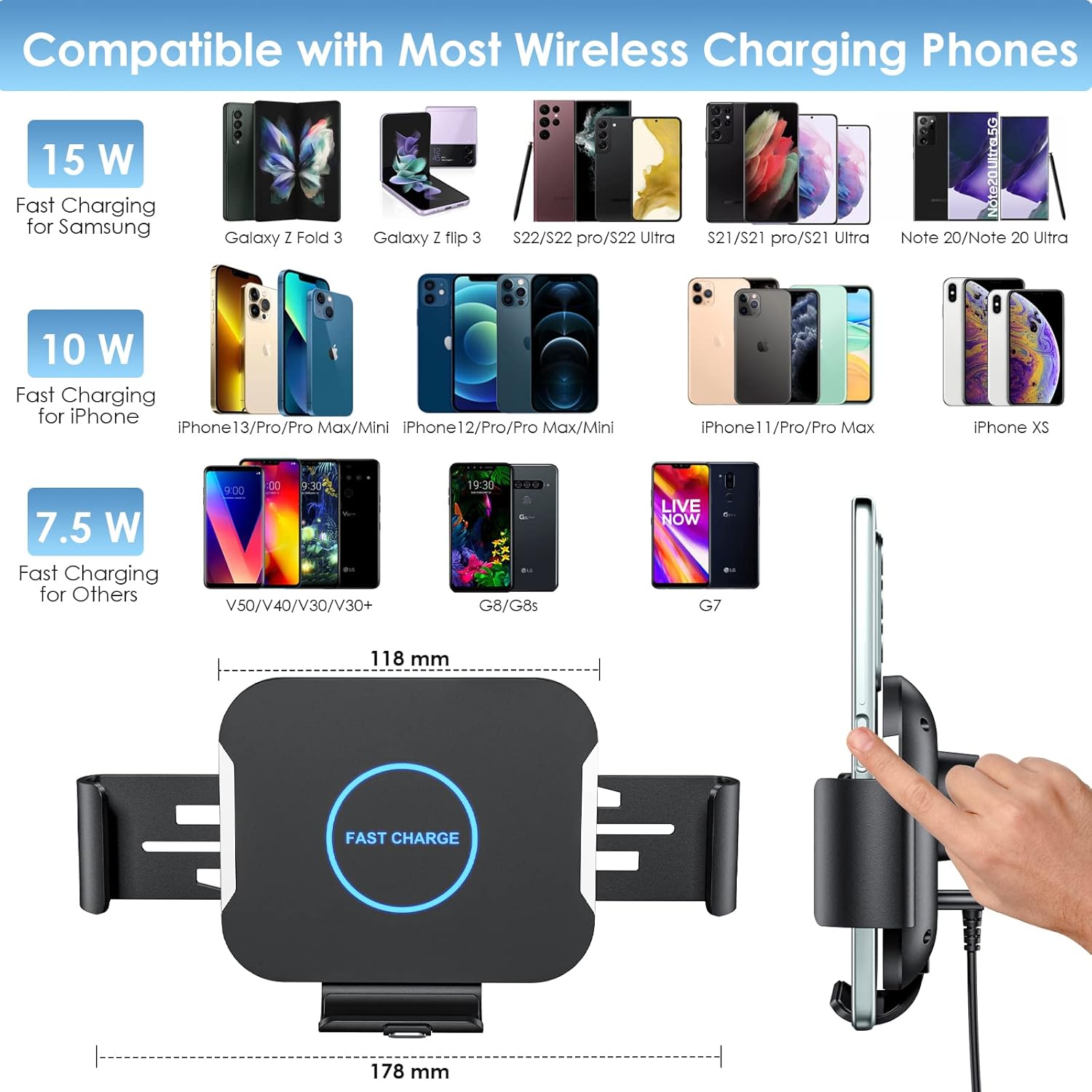 Smart Auto Clamping – Press the release button of the wireless handset holder and it will open automatically clamp your phone and start charging. This Qi wireless phone charger with built-in intelligent chip can protect your phone from overcharge, over current, short circuit, over high temperature, etc.