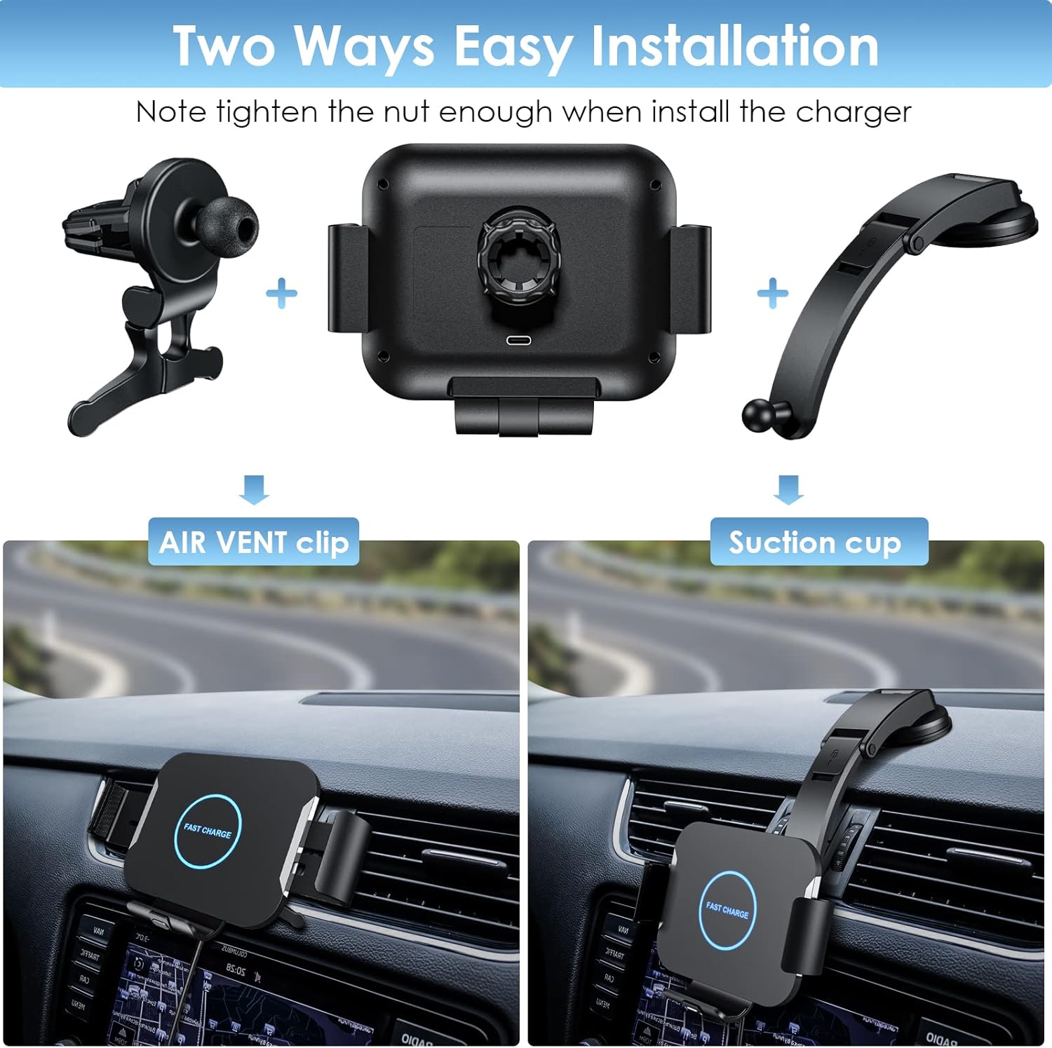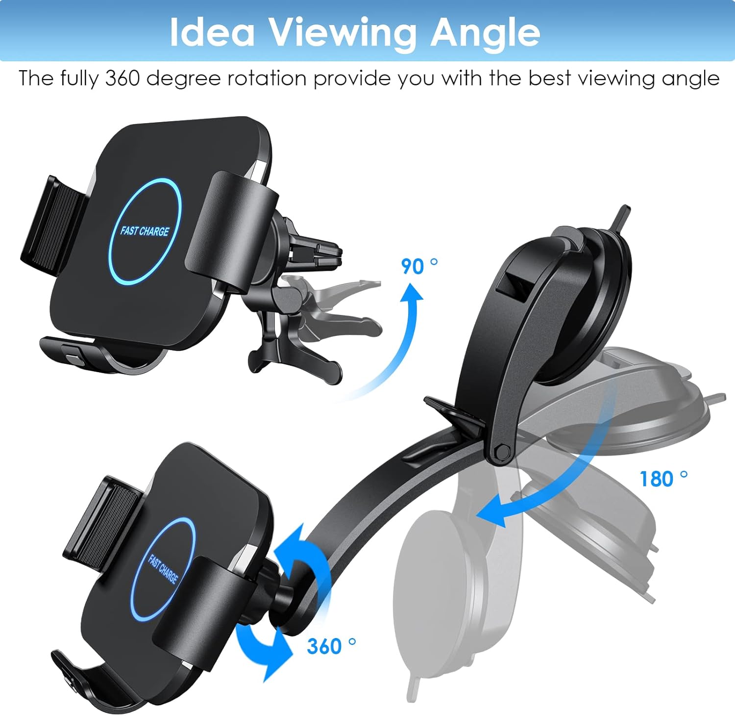 Strong Suction Cup & Adjustable Viewing – With 2 types of phone mounts. Multiple installation ways. The wireless car charger holder can be installed on the windshield, dashboard, table securely with the strong suction cup. Also can installed to Air vent with the air vent clamp. 360-degree rotation and adjust angle, two part can adjust angle allows for optimum viewing and easier use of functions