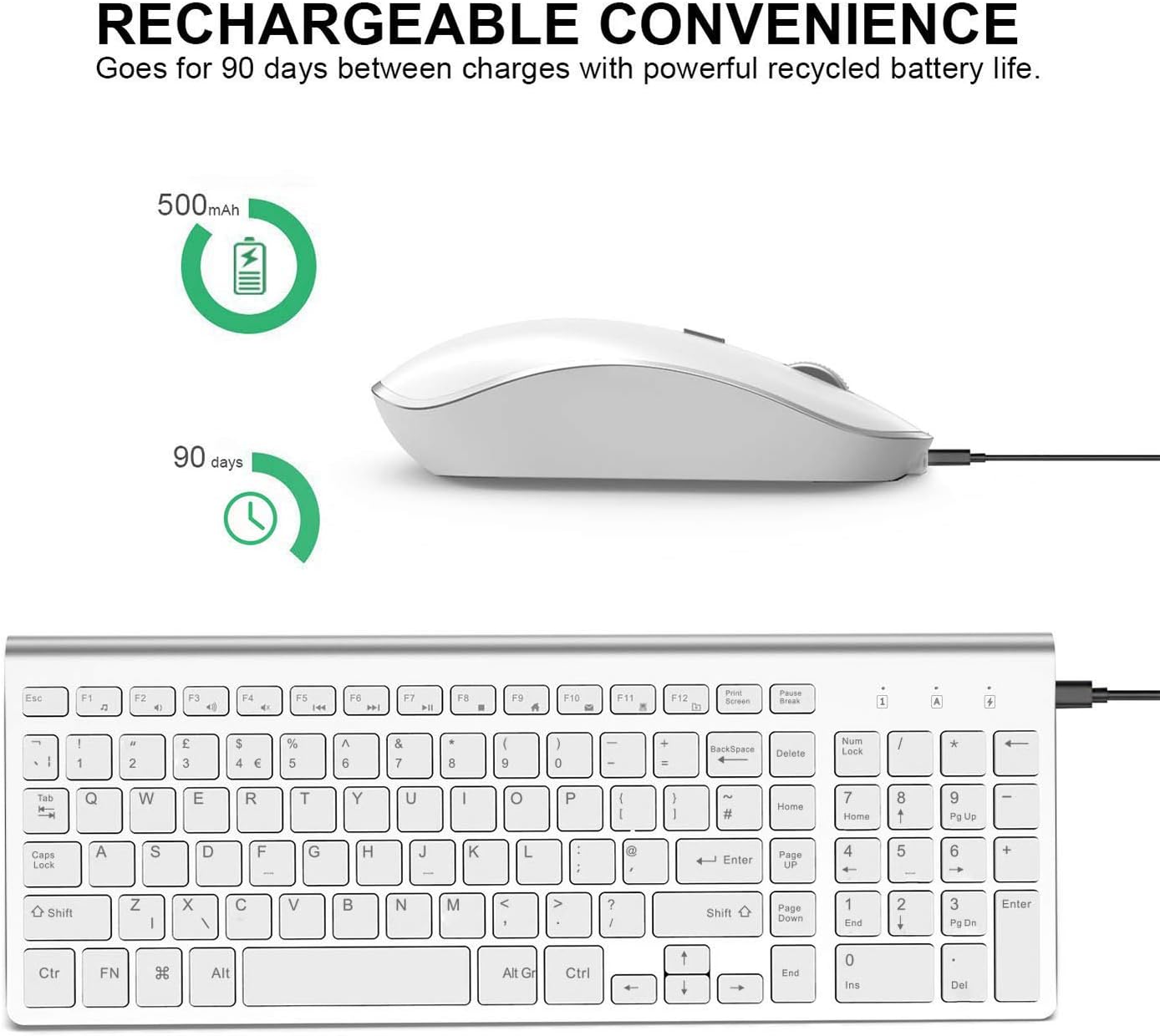 【RECHARGEABLE & AUTO POWER SAVING】Both Rechargeable keyboard and mouse is built-in 500mAh lithium-ion battery and offers up to 60days working time for mouse, 90days for keyboard if charge in full by 1.5 hours;Both devices will come into sleep mode if inactivities in 20s; and awarelessly wake them up by moving. (Battery is not included).