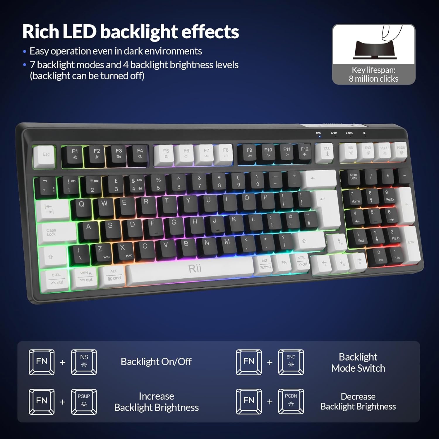 【Customizable Backlighting】This Wireless keyboard with 7 dynamic backlight effects, this gaming keyboard and mouse set enhance your setup while providing a visually stunning experience during late-night gaming sessions.