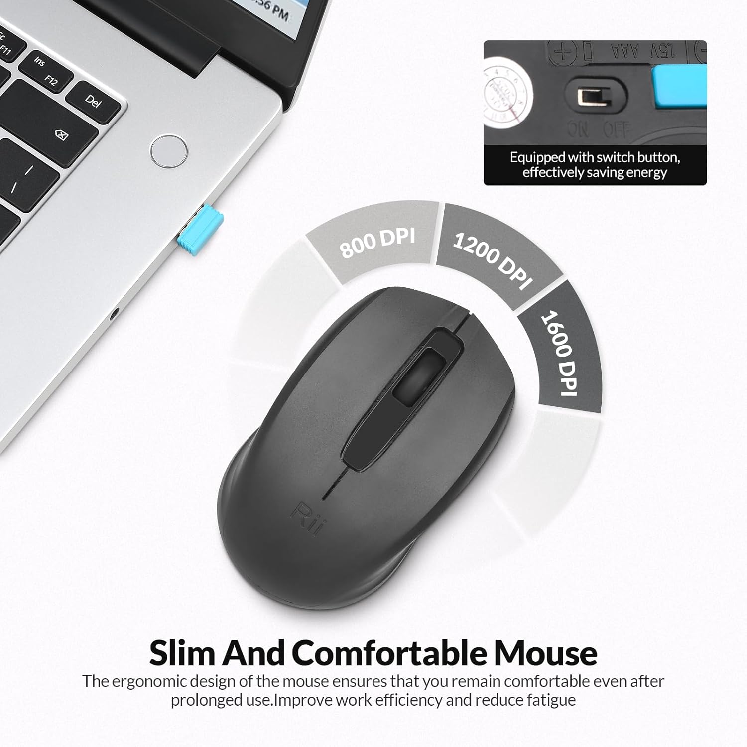 【Adjustable Mouse】The mouse features three adjustable levels (800/1200/1600) for precise control, along with a convenient power switch for easy battery management.
