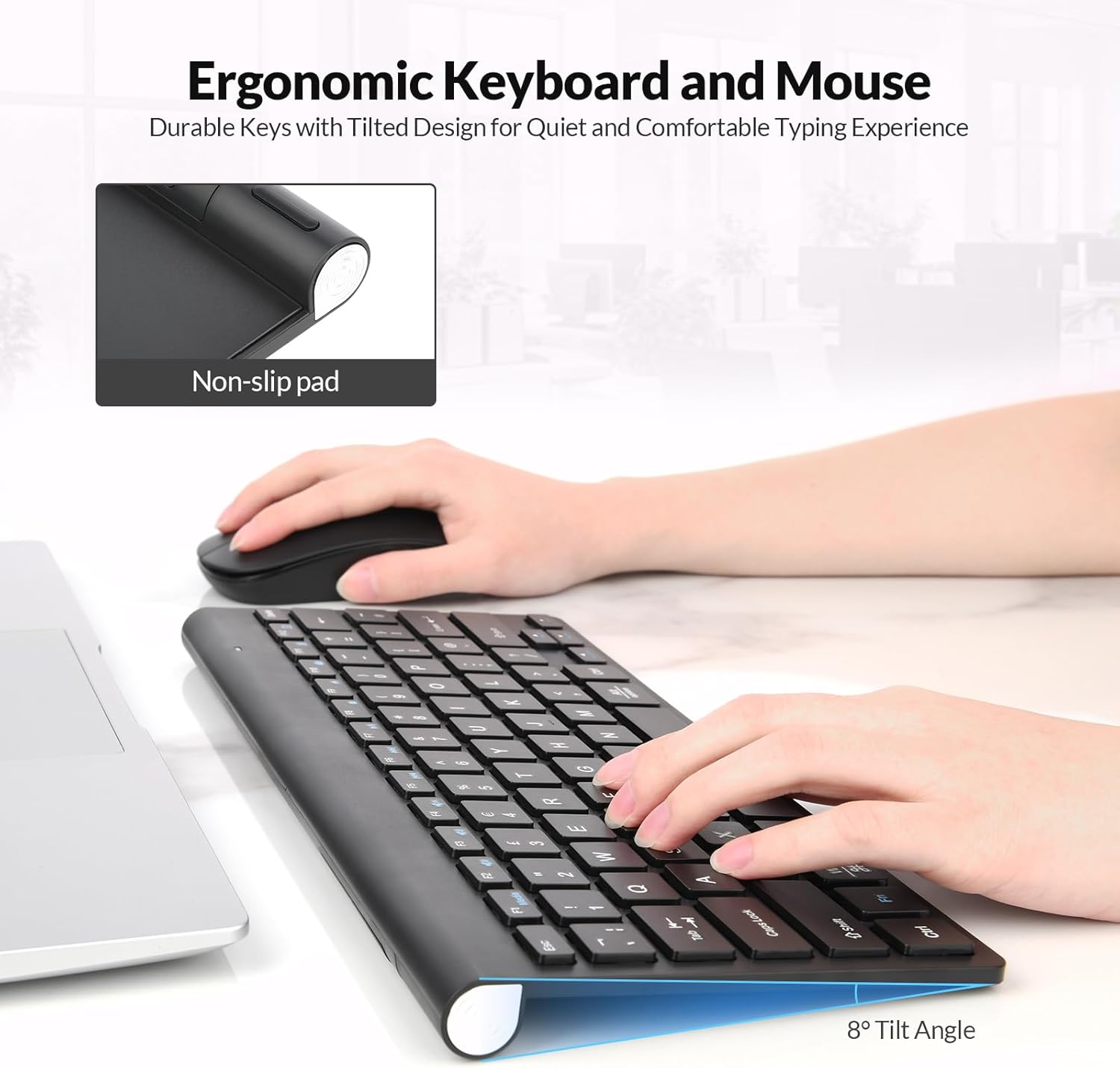【Silent and Comfortable Typing】Experience quiet, responsive typing designed for comfort during long hours of work or gaming. The ergonomic design of both the keyboard and mouse promotes a natural typing posture, reducing fatigue during extended use.