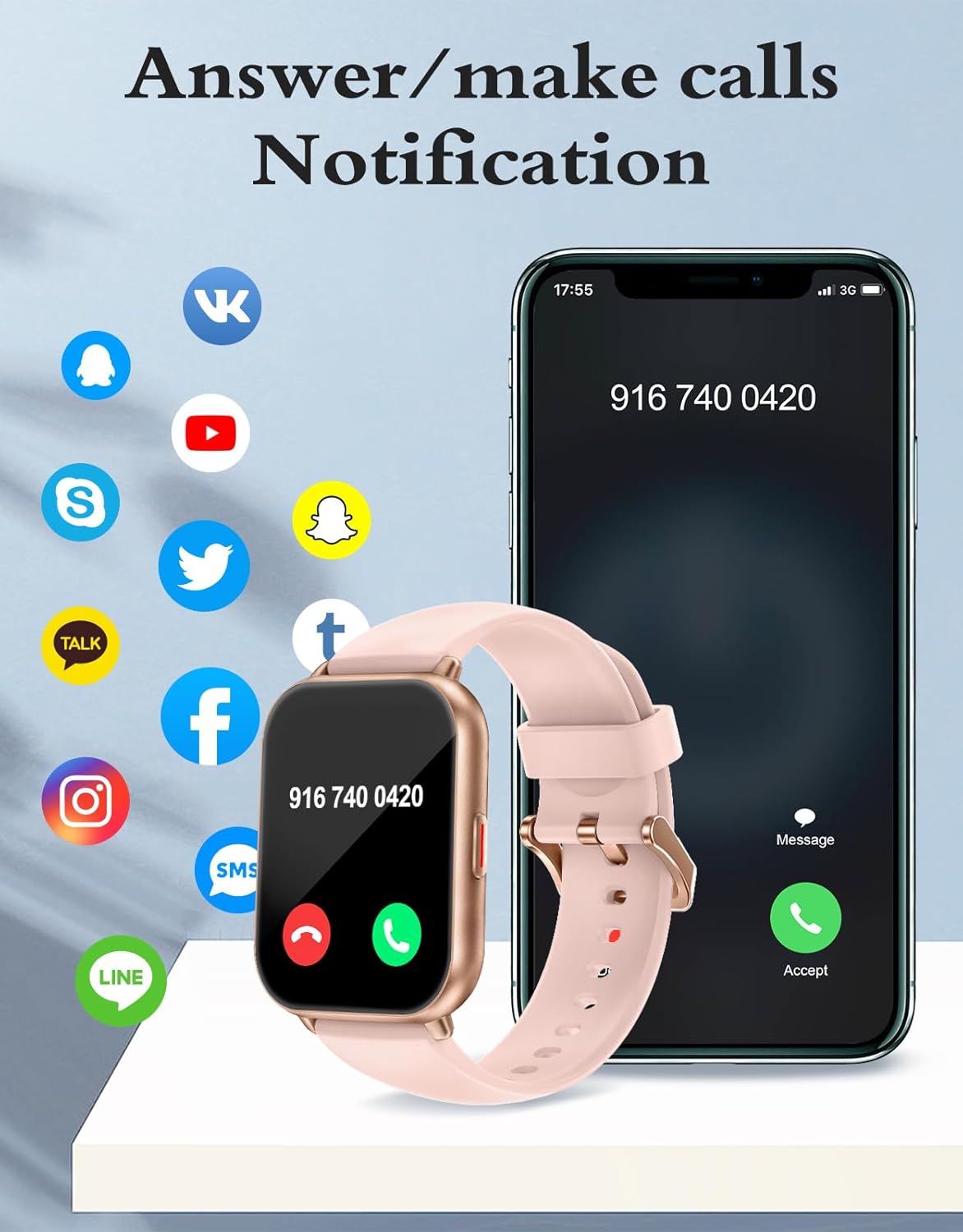 【Answering Calls/Dialing & Text/ Call Reminder】Built-in speaker, you can make calls or received calls through the watch after connecting to Bluetooth, you will not miss any important calls when you are exercising, cycling, running…(cannot support insert sim card). Support information reminder(Message, Facebook, Twitter, WhatsApp, Instagram, Wechat etc). Note: Can not reply to message.