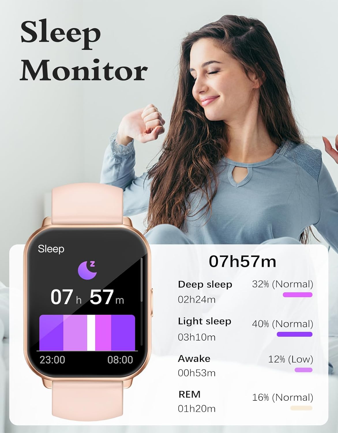 【Healthy Partner on The Wrist】The fitness watch records daily steps, distance, calorie consumption. Smart watch use high-performance sports optical sensors, which can monitor physical health indicators and 24-hour heart rate monitoring. It can monitor blood oxygen, sleep tracking, physiological cycle reminder. Connect the watch to the APP to check the body monitoring data which can help you better understand health and adjust lifestyle reasonably.