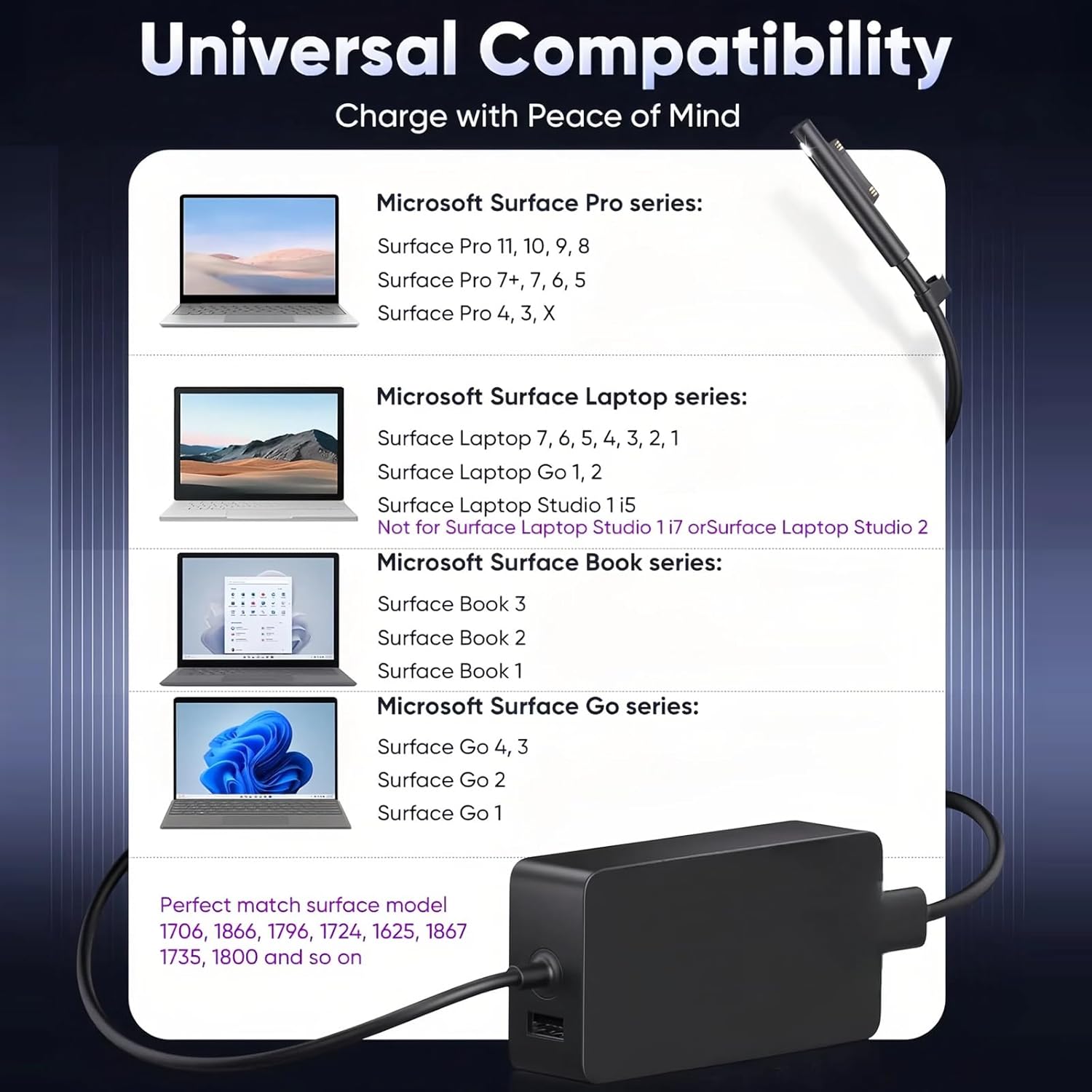 Compatible with Surface pro 9/8/7+/7/6/5/4/3/X Compatible with Windows Surface Laptop 5/4/3/2/1/Studio Compatible with Surface Book 3/2/1 Compatible with Surface Go 3/2/1 brand quality ensure the charging stability and safety, NO error message popping up Multiple Protections built-in multi safeguards to protect against overcharging, overheating, short circuiting Maintain battery health built-in original dynamic software and hardware systems to keep Maximum Battery Capacity to 98%, intelligently learning your daily charging routine to reduce battery aging Super Slim portable for travel Ultra long cable allowing you to charge and enjoy fun in your bedroom, sofa, library, office, even if you’re sitting in the back seat of a car