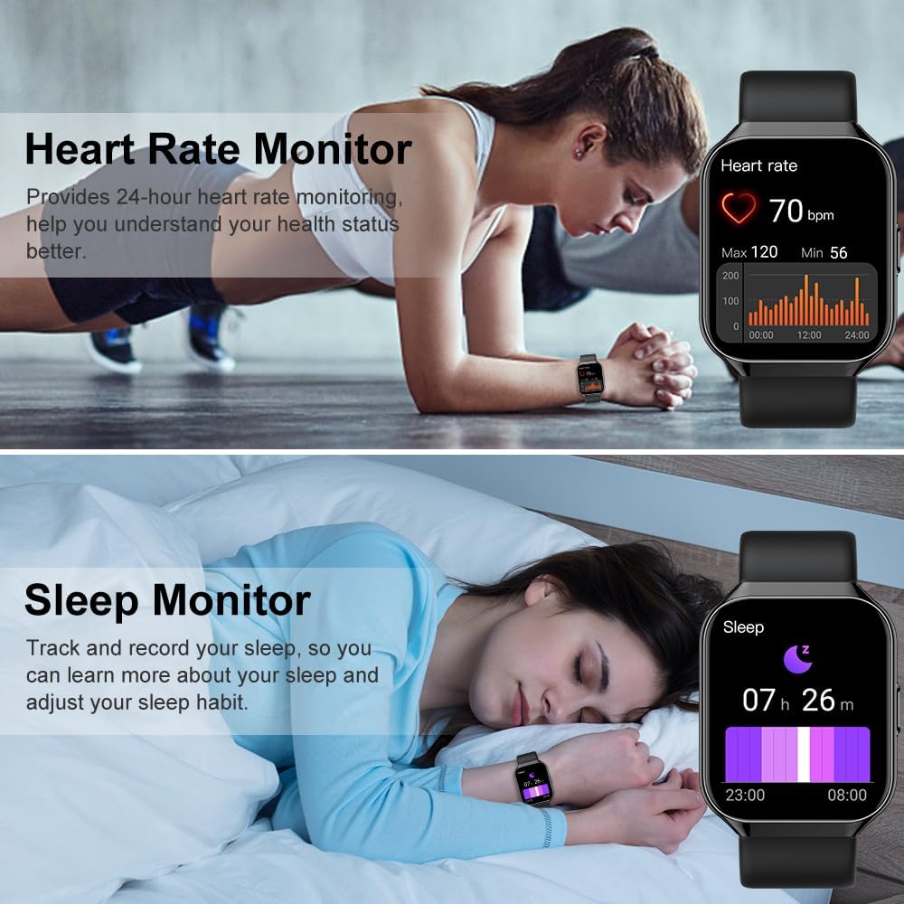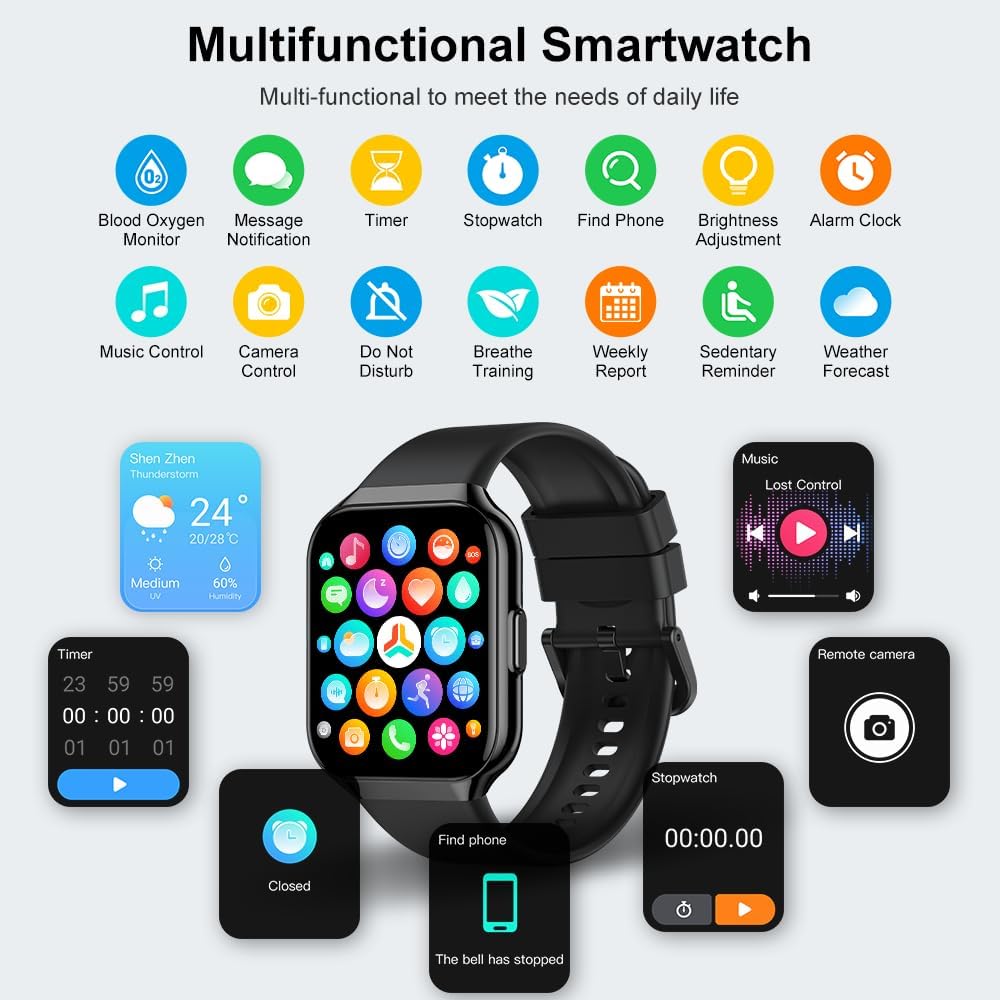 HEALTH MONITORING FUNCTION: The smartwatch adopts high-precision motion sensors and supports heart rate/blood oxygen/sleep monitoring. It can track your heart rate and sleep status (deep sleep/light sleep) for 24 hours to help you better understand your physical health. In addition, it has practical functions such as weather forecast, brightness adjustment, stopwatch, alarm clock, sedentary reminder, watch search and so on.