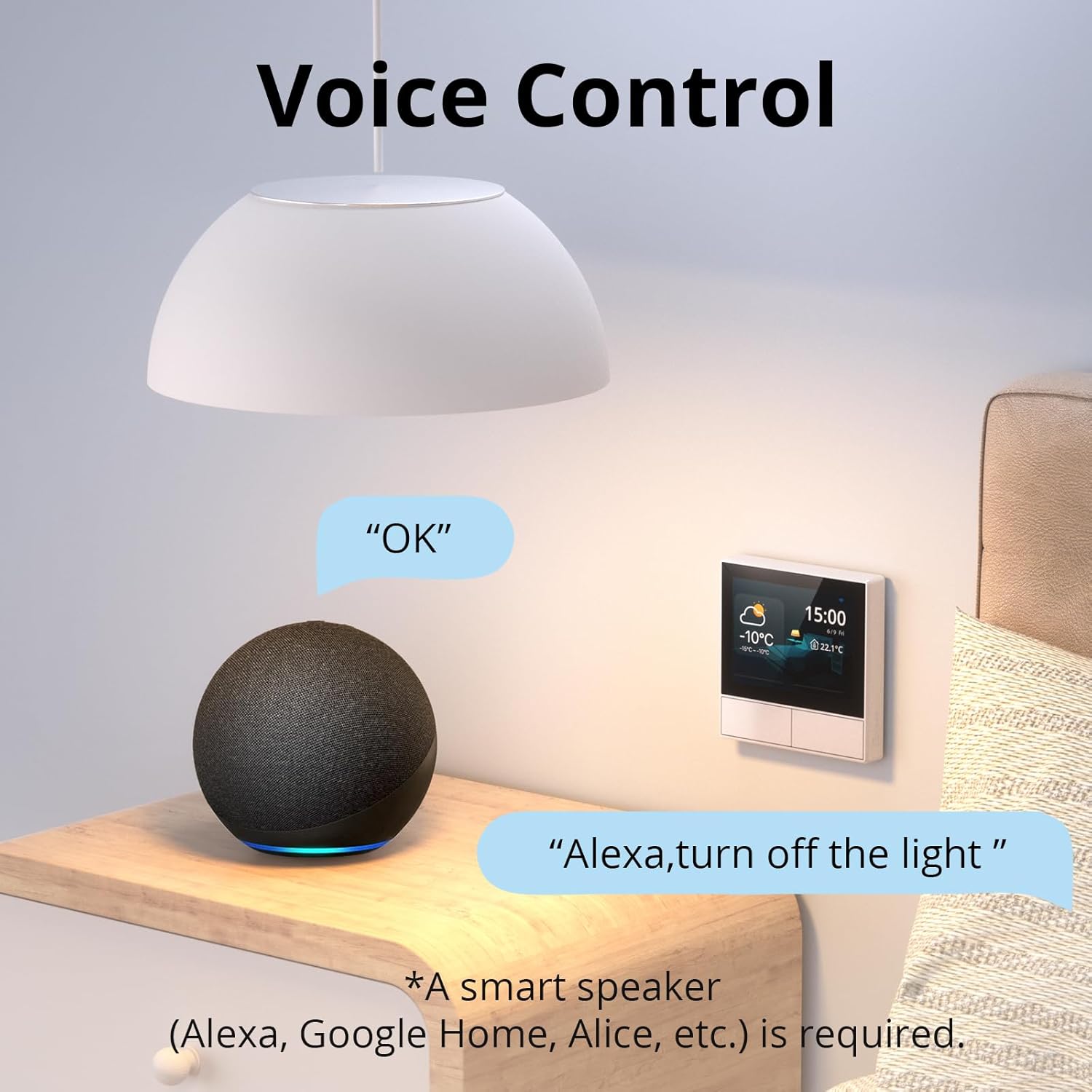 [ Voice And App Remote Control ] If you find it inconvenient to push the buttons, ask your Amazon Alexa or Google Home to help you control the two switch relays of NSPanel. When away, use the eWeLink app to control and monitor your devices in case forgetting to turn them off.