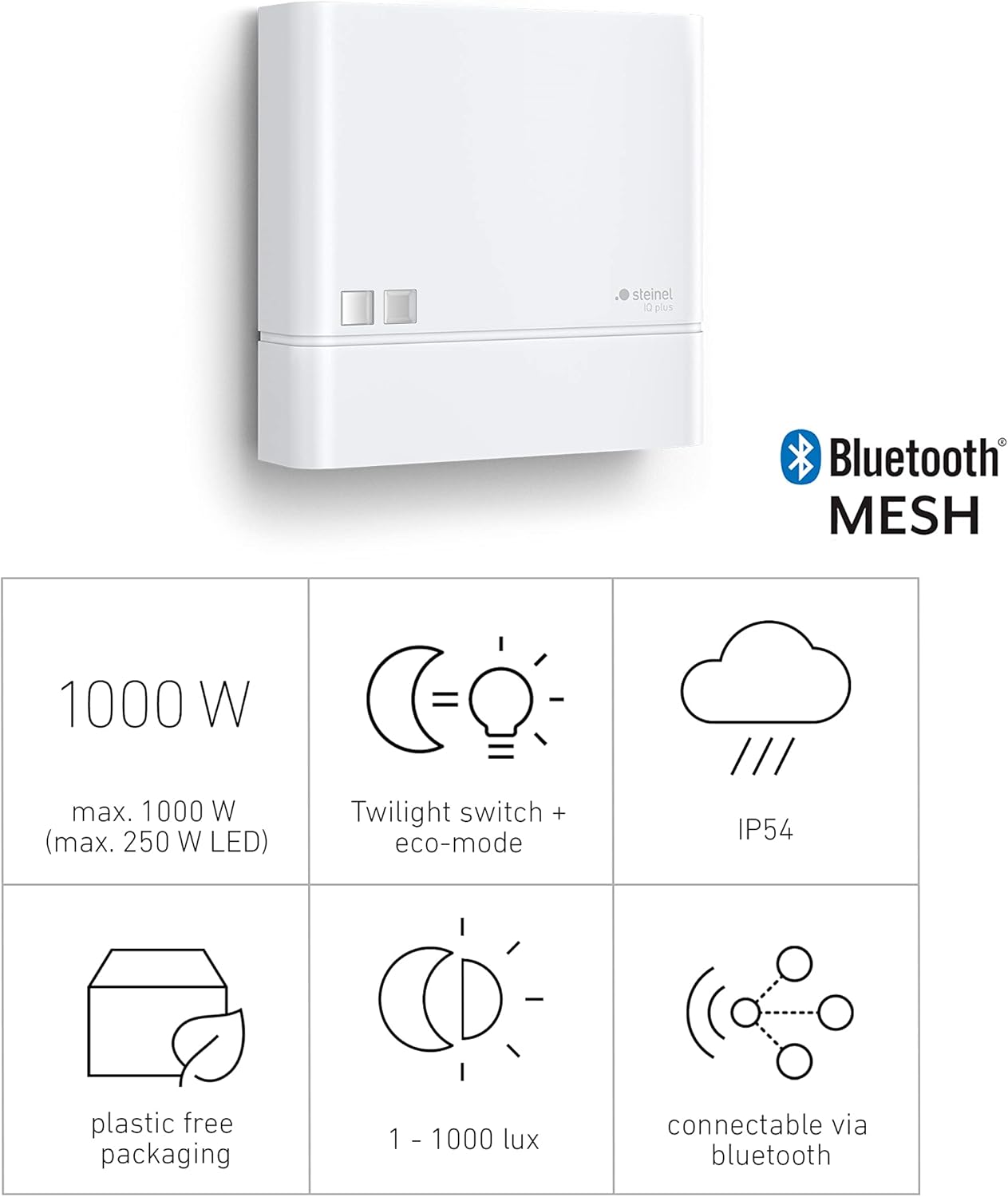 Switches any bulb – Existing outdoor lights or spotlights with up to 1000 W (with LEDs max. 250 W/50 pcs.) can be networked by cable or wirelessly via Bluetooth without any problems and switched on simultaneously when it gets dark