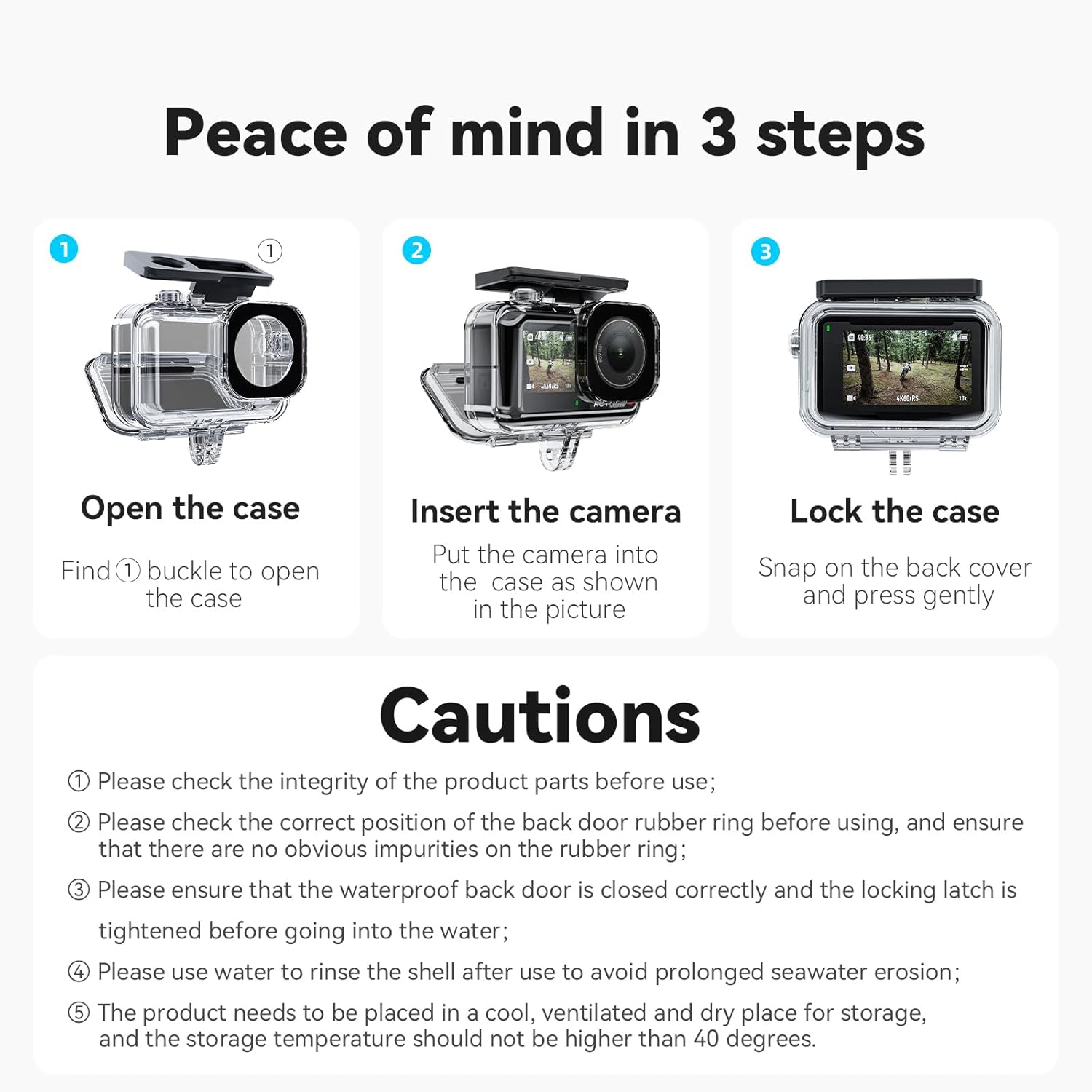 Professional Design Specially designed for DJI Action 3 camera, which fits perfectly and seals tightly, provides ultimate protection for your camera during extreme outdoor activities, deep-water diving, surfing, snorkeling and other water sports activities.
