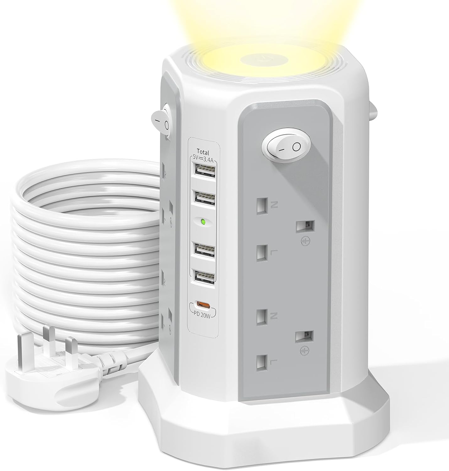 Tower Extension Lead 3M and Night Light, 5 USB Ports & 8 Way…