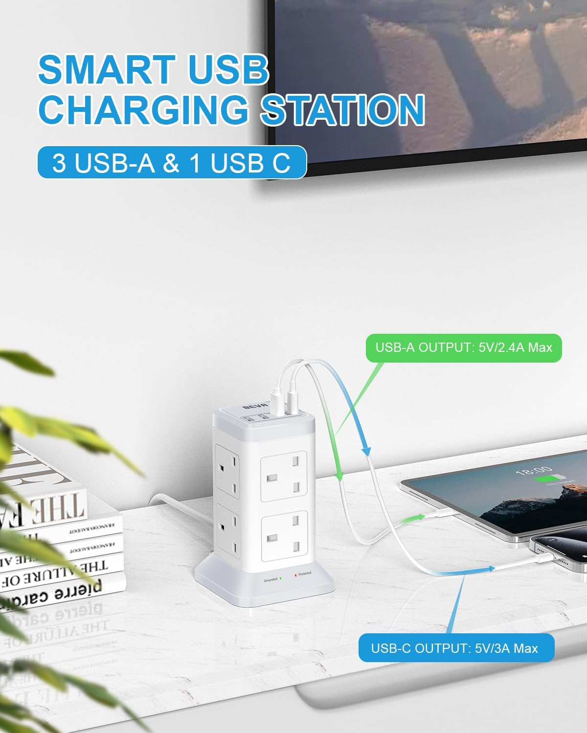 Power Tower with USB Ports: Comes with 3 USB-A (5V/2.4A max output) and 1 USB-C port (5V/3A) with smart charging technology that detects the USB device connecting and adjusts the current output for optimal charging efficiency, BEVA USB extension cable is ideal for cellphone, tablet, smart watch, earphone, etc.