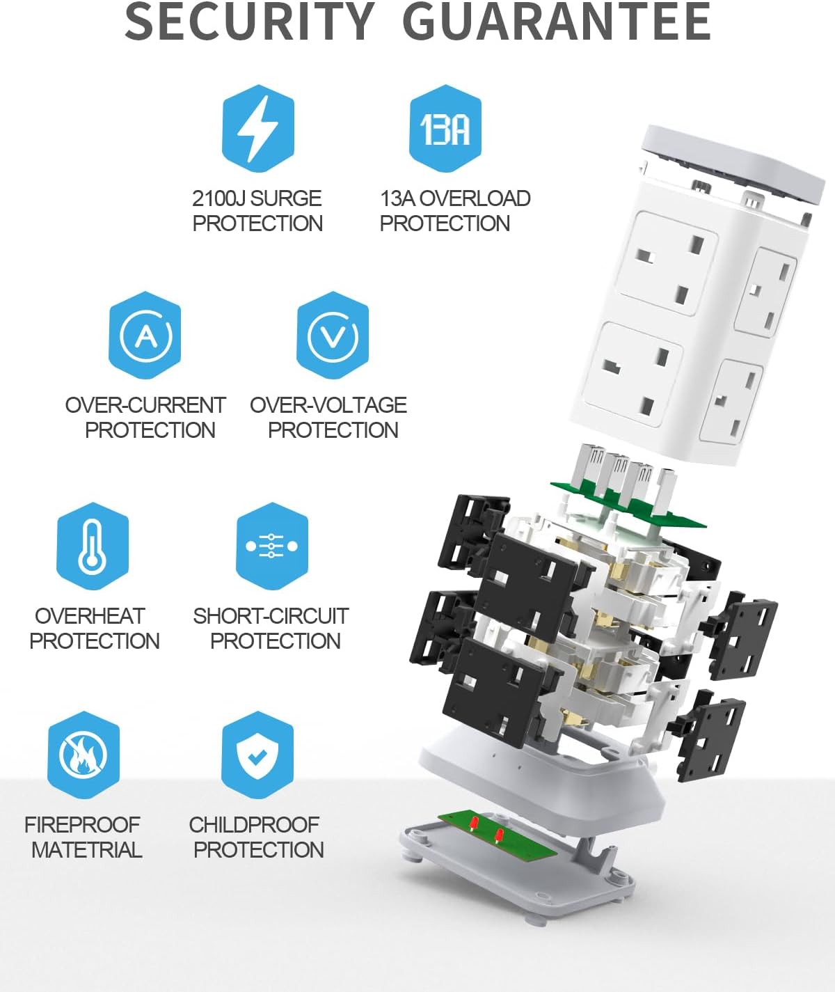 The plug tower comes with an overload protection reset switch to control all outlets and usb ports. It will automatically break off when the current exceeds threshold 13A, preventing your devices from fire, sparks or other damages.