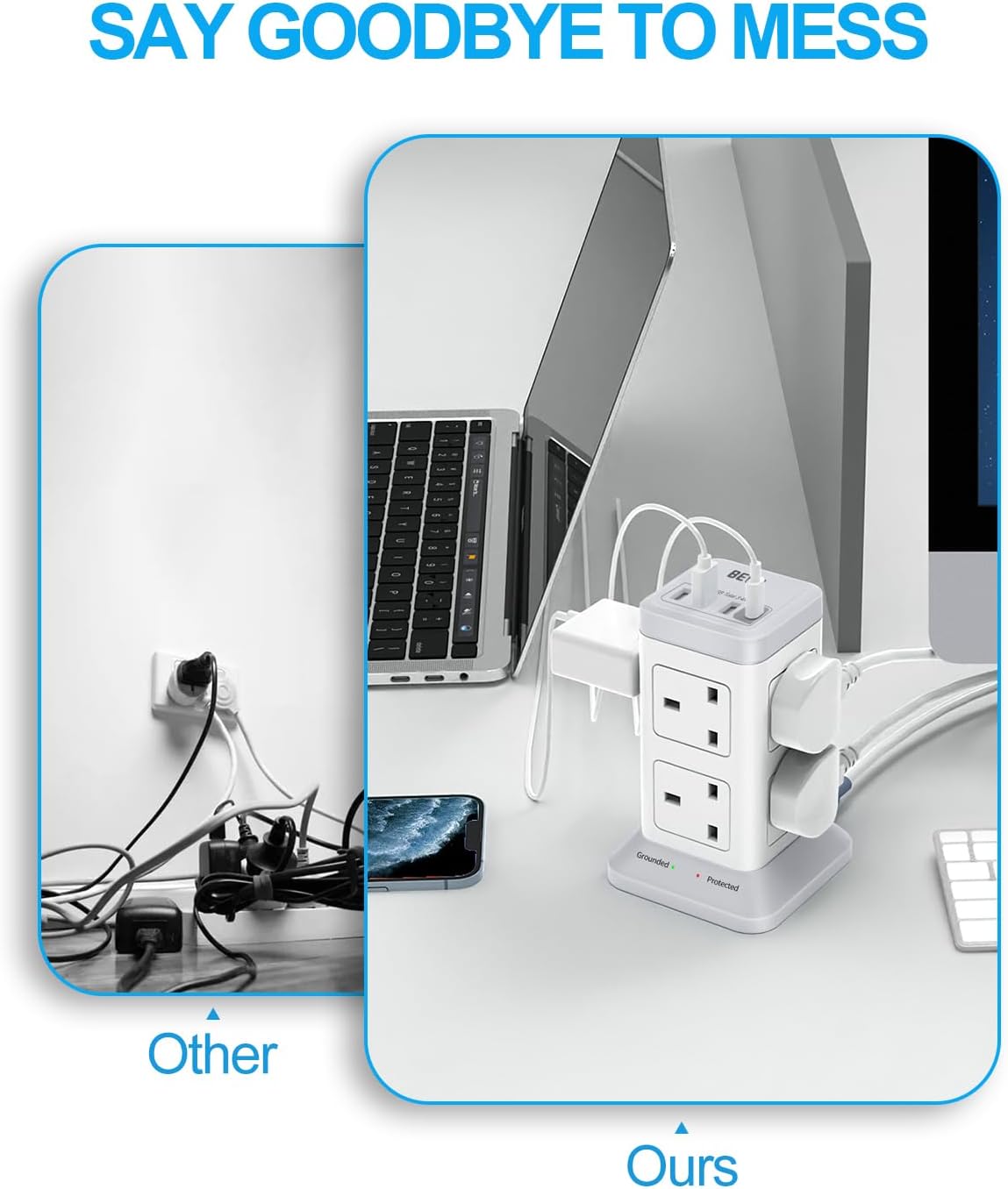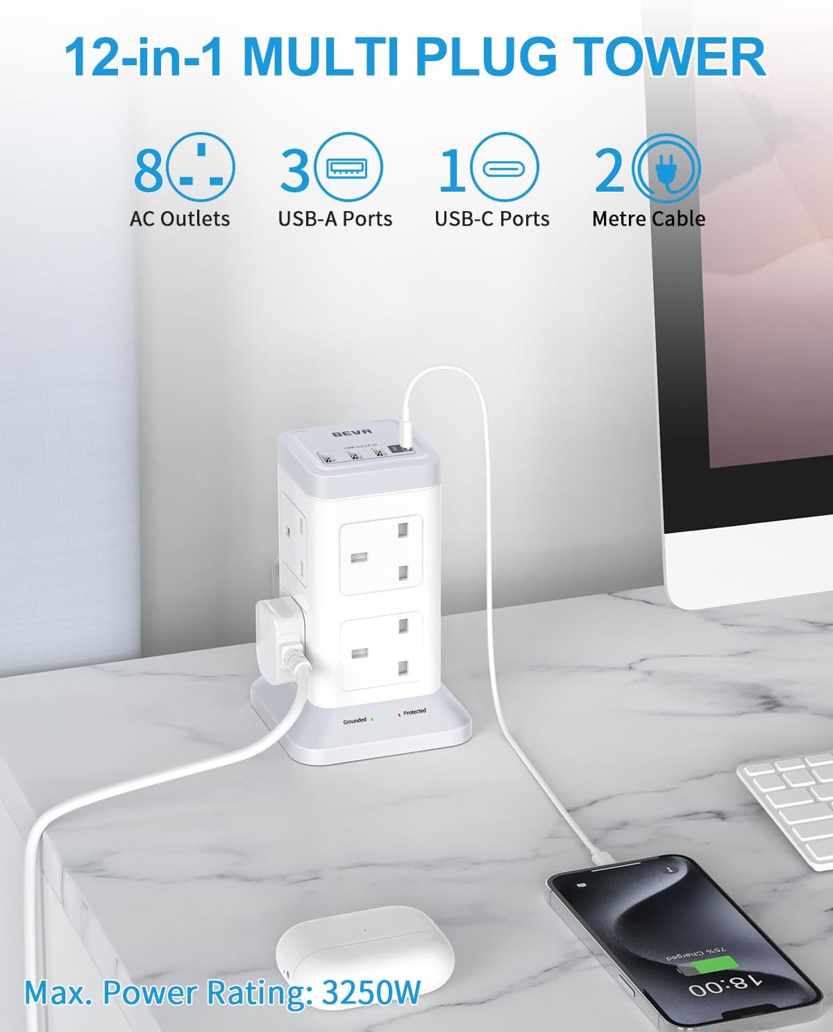3250W for High-rated Power Appliances: The BEVA Tower Extension Cord has a UK standard plug with a 13A fuse and a total output of up to 3250W, allowing it to power high power appliances, just make sure the total power of electric appliance does not exceed 3250W.