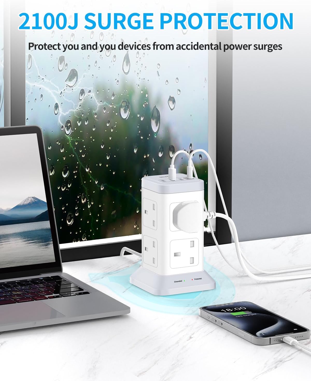 Surge Protector: The power tower is also a surge protector, provides a max 2100 Joules energy rating to protect your electronic devices from accidental power surges such as thunder and lightning.