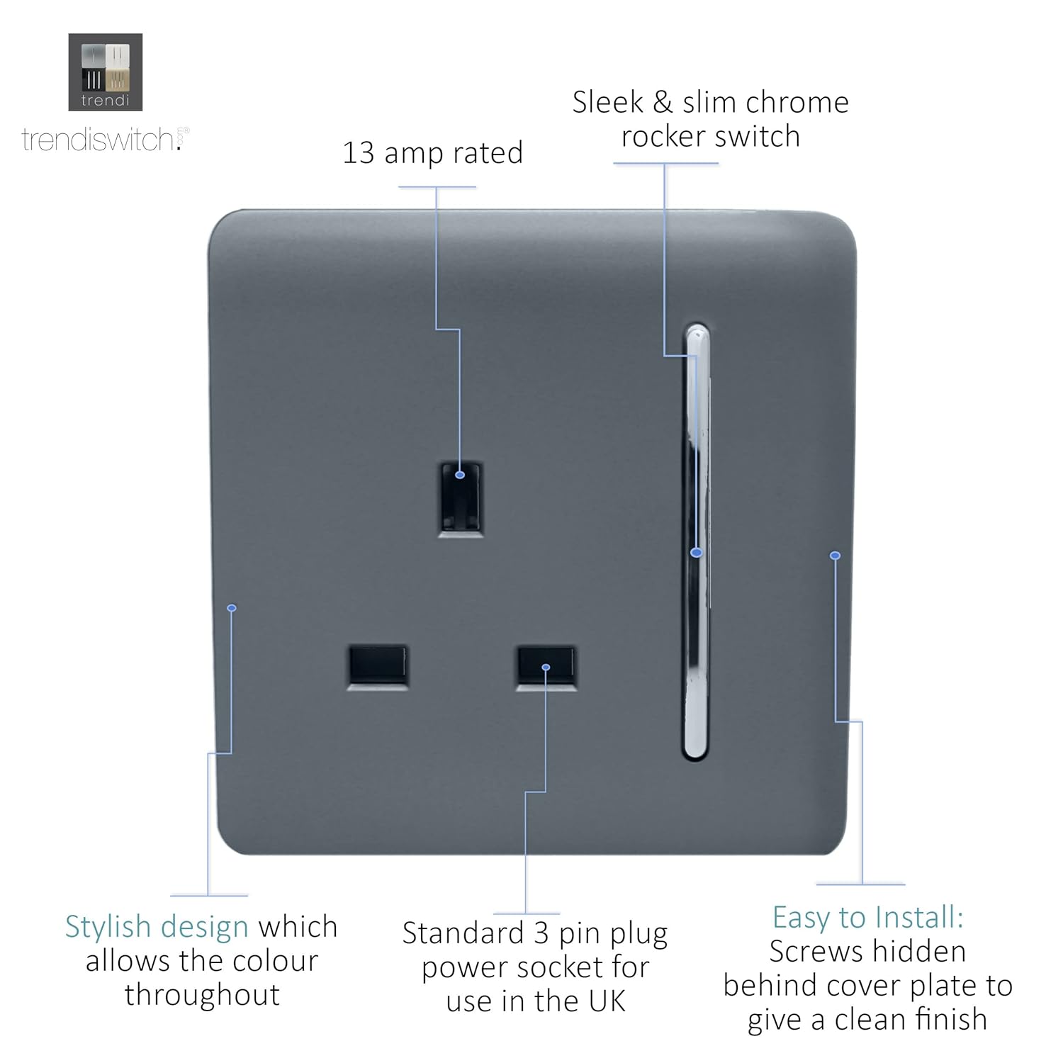 A WARM GREY 1 GANG PLUG SOCKET MADE FROM HIGH QUALITY FIREPROOF ABS PLASTIC: From Trendiswitch, screwless plate with a sleek and modern appearance – making decorating a breeze.