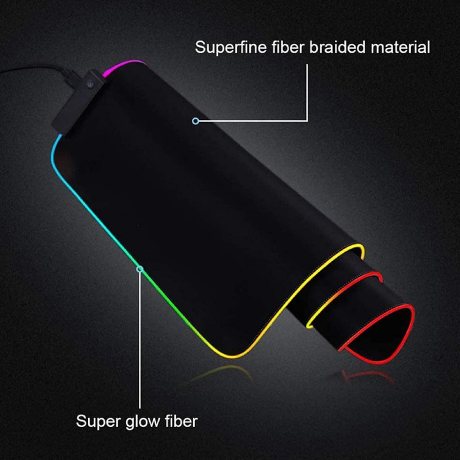 Gaming mousepad with labeled features: 'Ultra Smooth Surface', 'Superfine fiber braided material', 'Anti-slip Rubber Base', 'Super glue fiber'. Blue edge lighting visible.Gaming mousepad with labeled features: 'Ultra Smooth Surface', 'Superfine fiber braided material', 'Anti-slip Rubber Base', 'Super glue fiber'. Blue edge lighting visible.