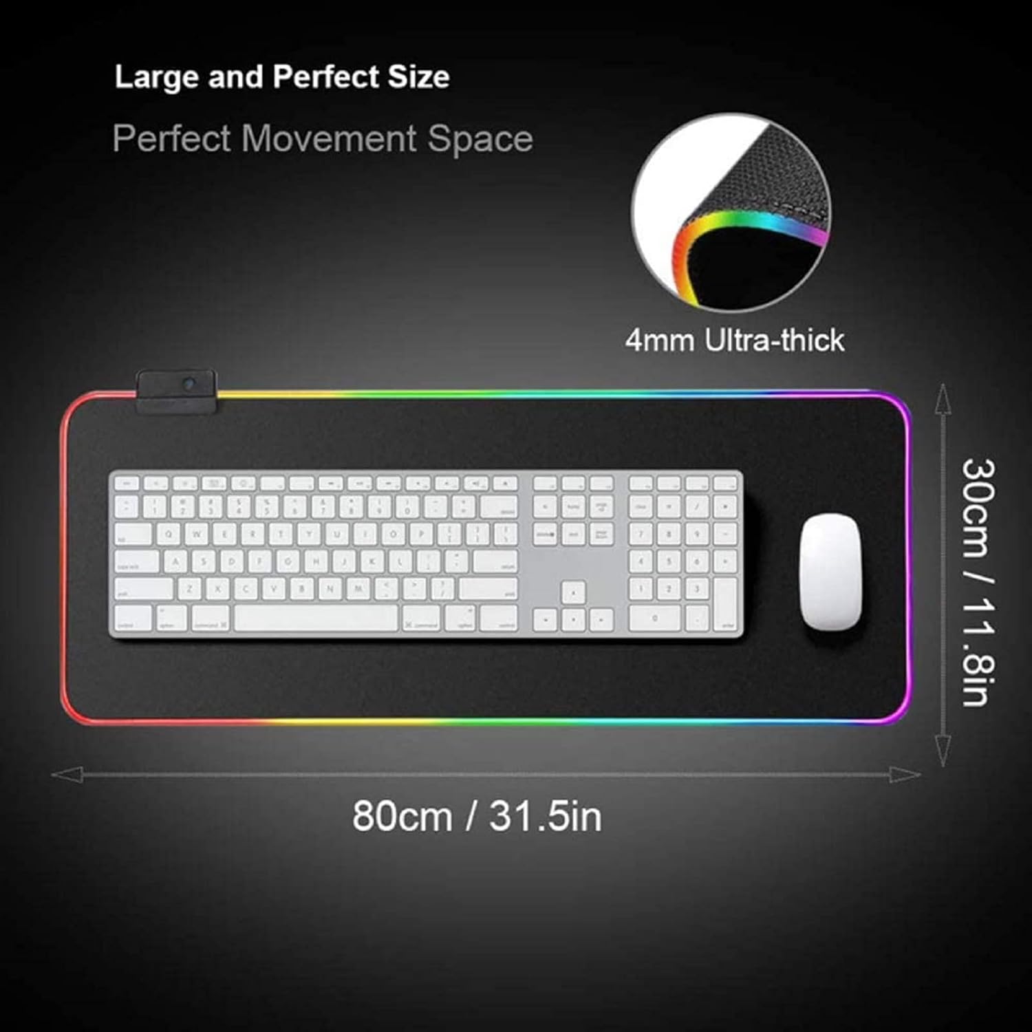 [Large size] The size of the RGB mouse pad is 800×300×4mm, which provides enough mouse movement during gaming. It fits your mouse and keyboard perfectly and still has plenty of room for movement. It is suitable for all types of keyboards and mice, providing ample space for professional games or office work.