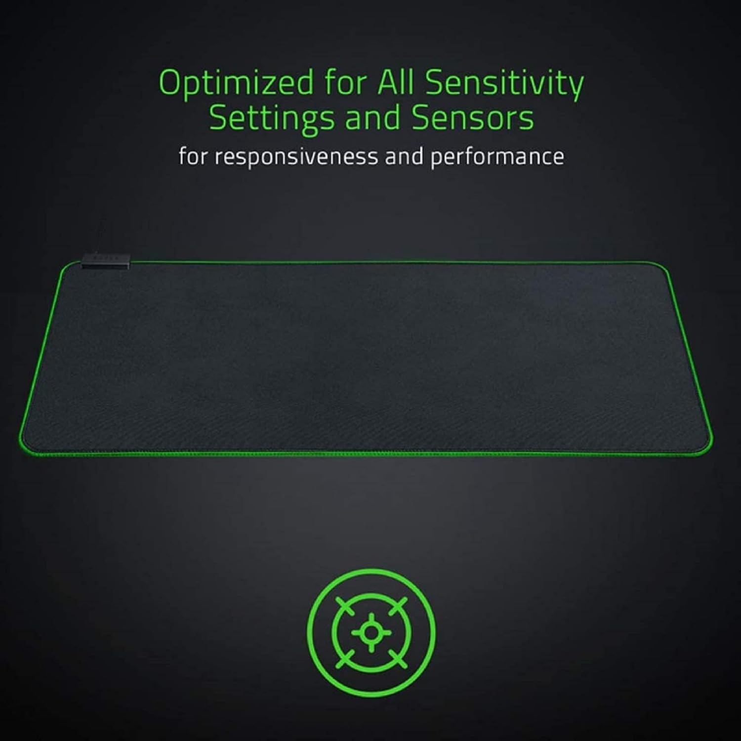 Black background with green rectangular shape, likely a mouse pad or gaming surface. Text mentions optimization for sensitivity settings and sensors.Black background with green rectangular shape, likely a mouse pad or gaming surface. Text mentions optimization for sensitivity settings and sensors.