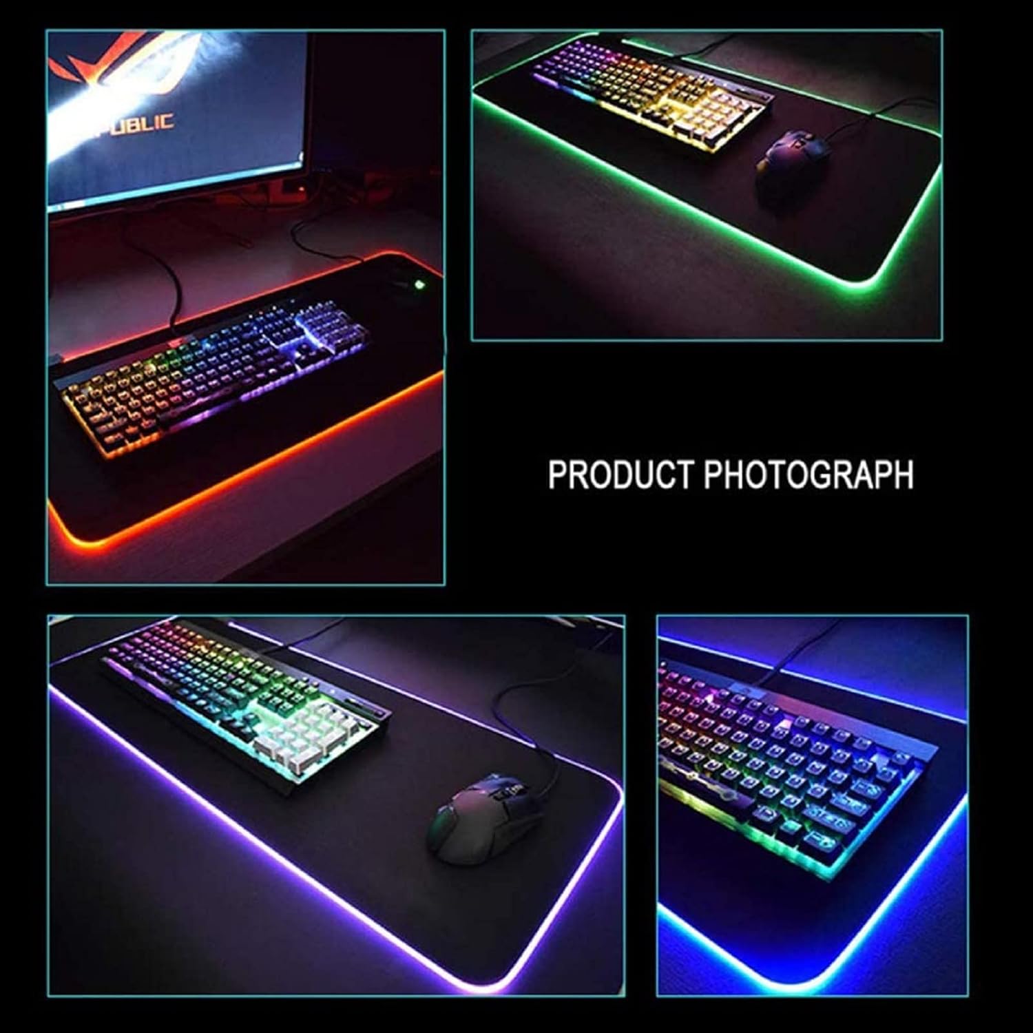Four-panel product display of RGB gaming keyboards and mousepads with colorful LED lighting effects. Text overlay: 'PRODUCT PHOTOGRAPH'.Four-panel product display of RGB gaming keyboards and mousepads with colorful LED lighting effects. Text overlay: 'PRODUCT PHOTOGRAPH'.