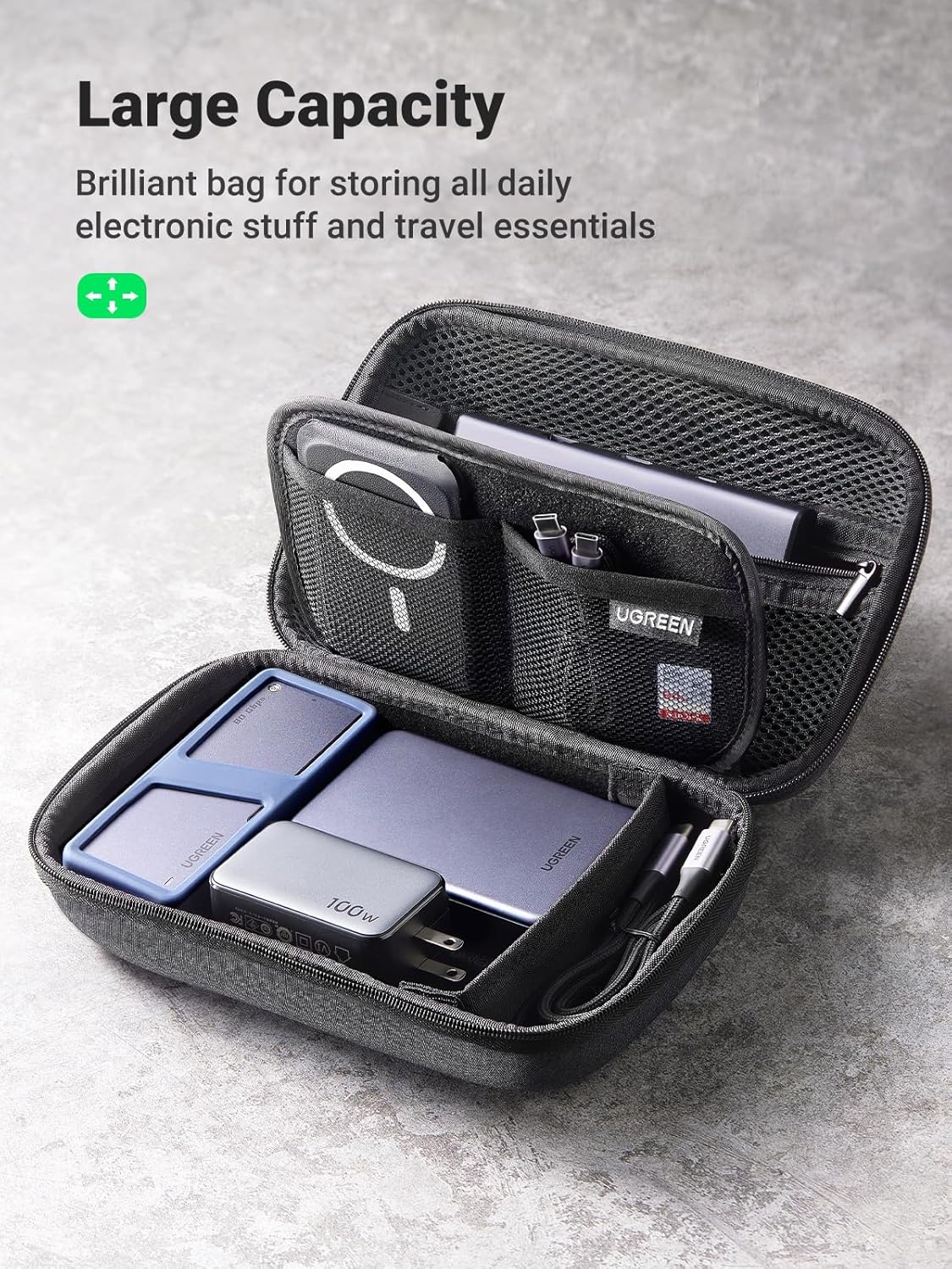 Spacious Organiser for Travel: The UGREEN Large Cable Organiser Bag offers more room for chargers, power banks, adapters, mice. Keep all your tech accessories neatly organised and easily accessible during trips or daily commutes.