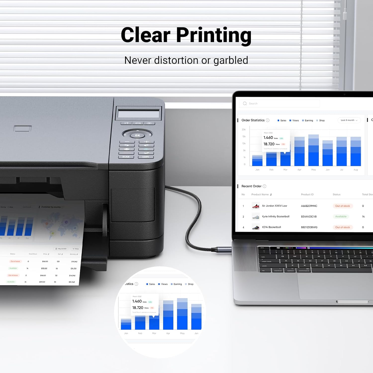 Enhanced Durability: The USB type C printer cable features a wear-resistant aluminum alloy shell, a space grey color that matches your MacBook. The durable nylon braided lead, antioxidant nickel-plated, 11.5mm reinforced connector for additional durability