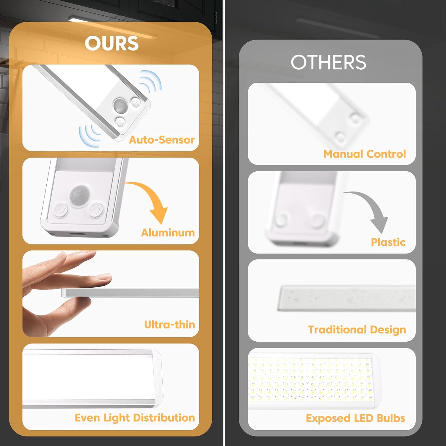 Aluminum & Slim Under Counter Lights – Unlike other plastic and low-quality led under cupboard kitchen lights, our cupboard lights feature high-quality aluminum alloy frames combined with durable ABS, creating a excellent balance of strength and modern aesthetics. Our under cabinet kitchen lights integrate seamlessly into your kitchen or workspace, finally reducing the bulky, awkward look of ordinary shop lights, making food prep and your home office area feel more organized.