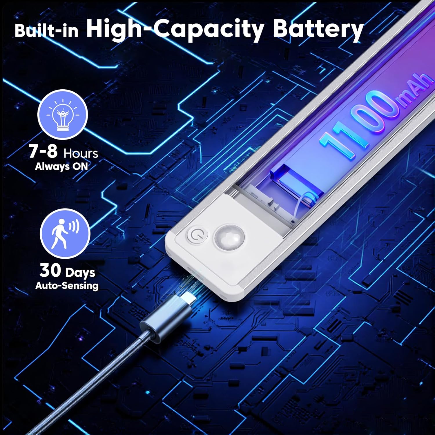Long-Lasting Battery & Usb-C Rechargeable Light – Under cabinet lights powered by a 1100mAh built-in battery, reduces the need for constant recharging. Enjoy up to 7 hours of bright, continuous light for extended tasks, or let it in auto-sensing mode for up to 30 days of hands-free operation(approx. 10 triggers/day). The kitchen strip lights come with 2 USB-C cables, allowing you to easily power them up at home, or from a power bank for a convenient plug-and-forget lighting solution.