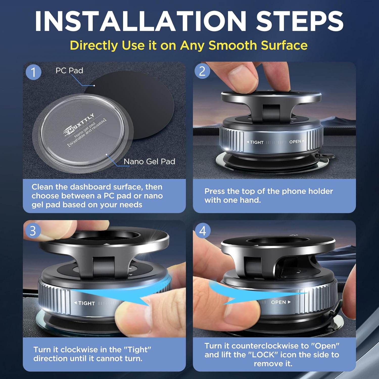 🌟【Strong Adsorption】MSXTTLY Suction Phone Holder uses an innovative rotating lock vacuum suction design. Turn the dial clockwise for a secure attachment to any smooth surface, and counterclockwise for easy removal without residue. It remains stable on bumpy roads, sudden brakes, or turns, ensuring your phone stays firmly in place.